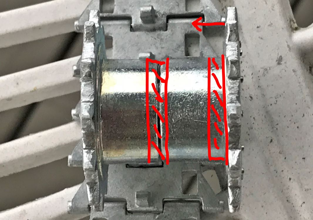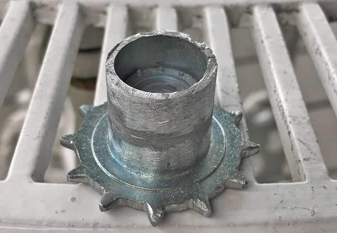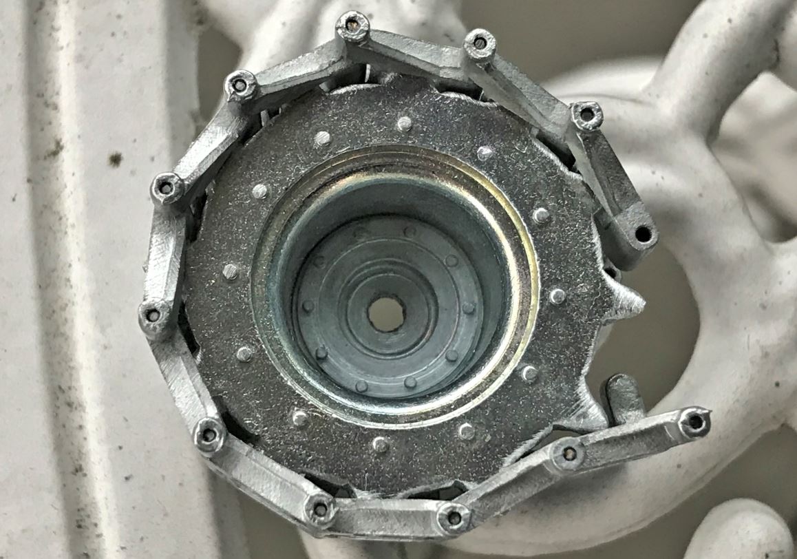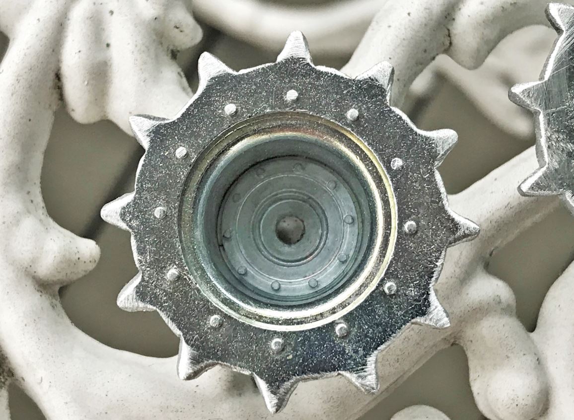The teeth are hand carved with a hand file, not leaving any sharp corner on them. It makes them run more smoothly with the tracks. The process needs to be done 4 times, once for each sprocket side.