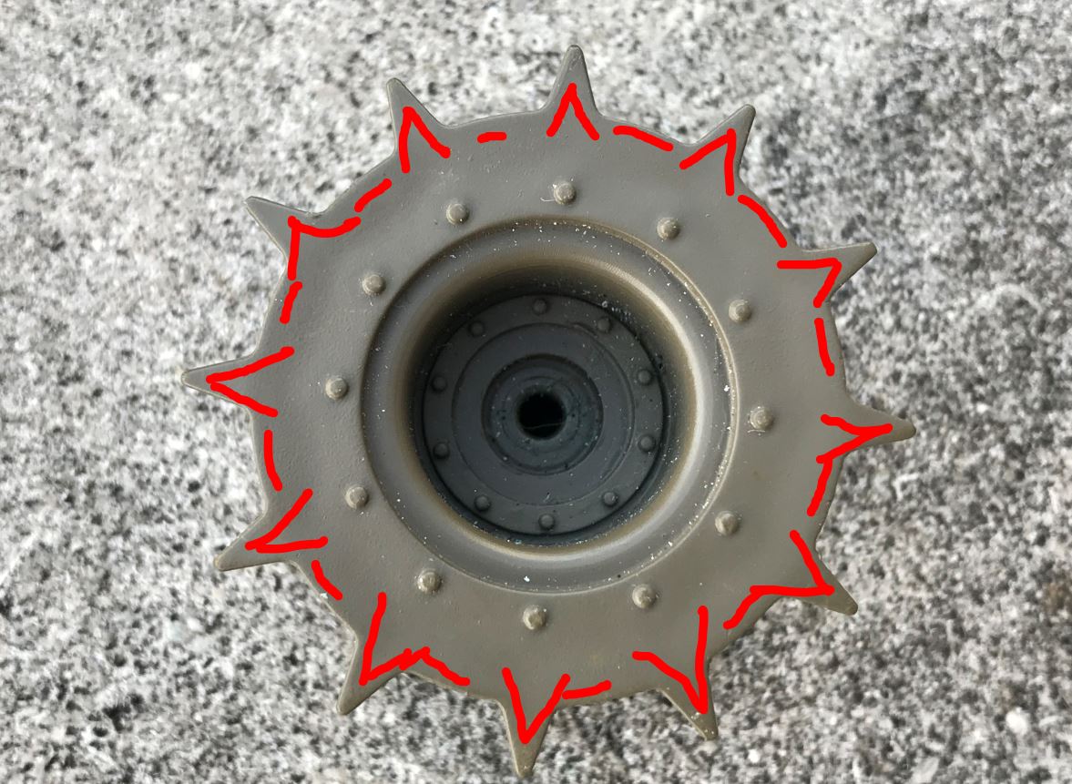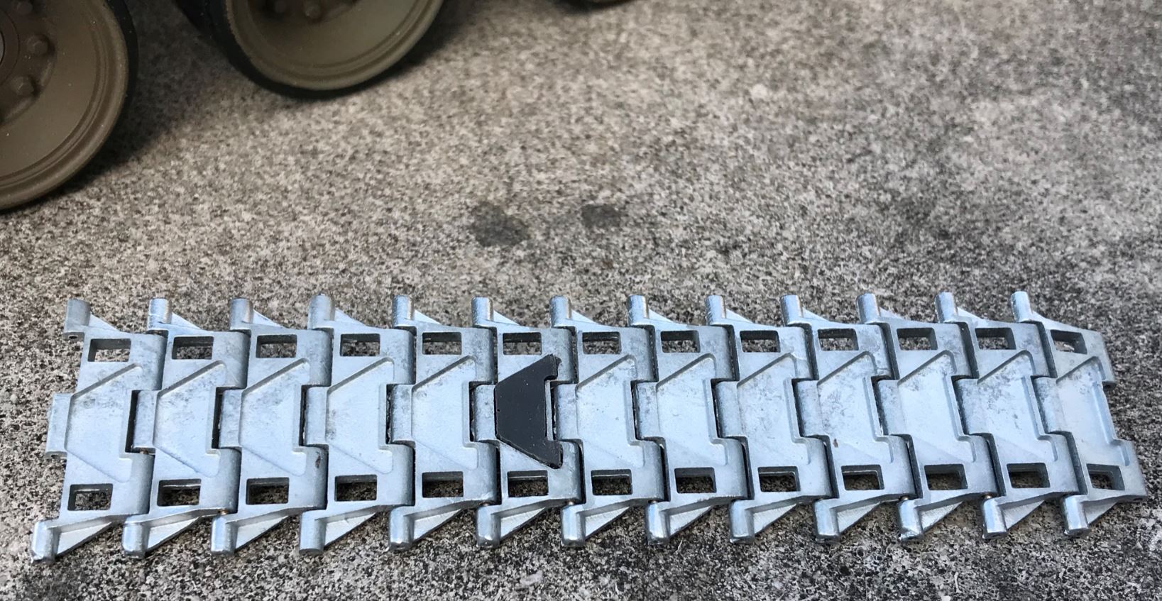 The real M41 sprocket is actually a bit smaller than the Heng Long model scaled rendition. The reduction in diameter actually meets the dimension they should be. Also notice that the teeth are not as long and pointed as Heng Long made them.