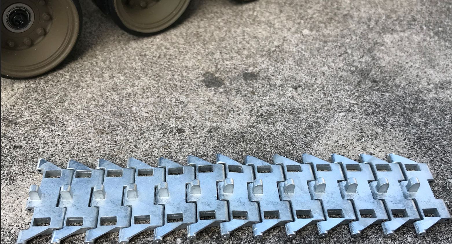 Here are the tracks and sprockets. I am pleased to say that Plan A, the resizing of the sprockets diameter, was a success.
