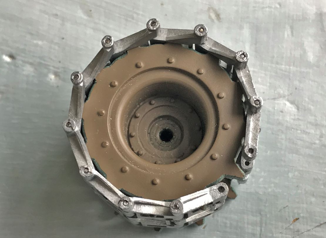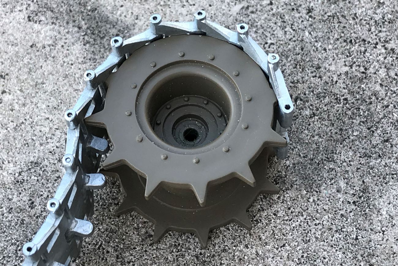 For the resizing, i recommend practice with one of the plastic sprocket. Although tempting to keep the plastic sprockets for the model, I do not think they would last long with the metal tracks. And resizing the plastic one is not simple either. Metal might be harder to work with, but it is also harder to make mistakes. One or two bad strokes of the file on one of the fragile plastic tooth and it is ruined, not so easy with metal.