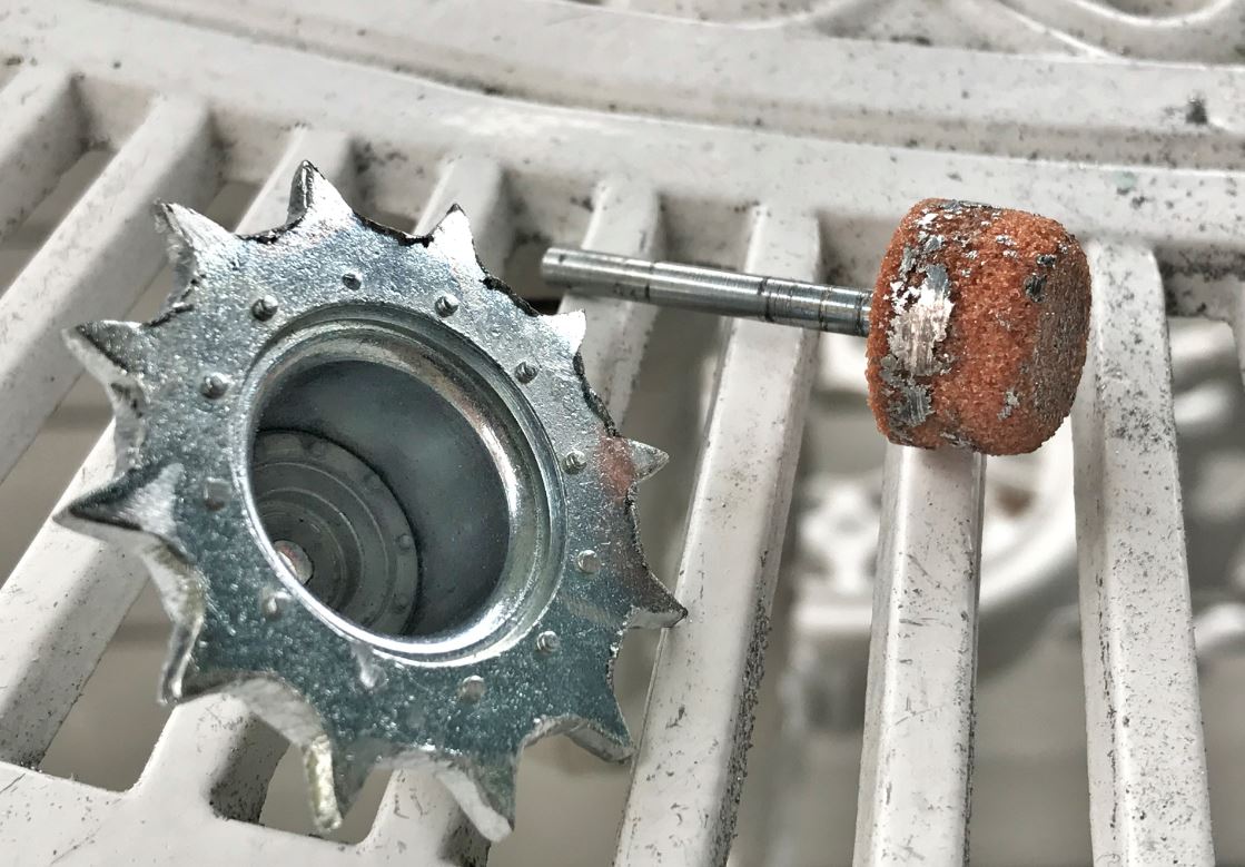 Doing the same with the Mato metal sprockets in a step by step description. Step 1, the heavy grinding was done with the Dremel, removing about 2.5mm of diameter on the main wheel, leaving the teeth alone. I sacrificed two of my Dremel bits in the process, money well spent... The fine tuning of the metal teeth was done carefully with a hand file.