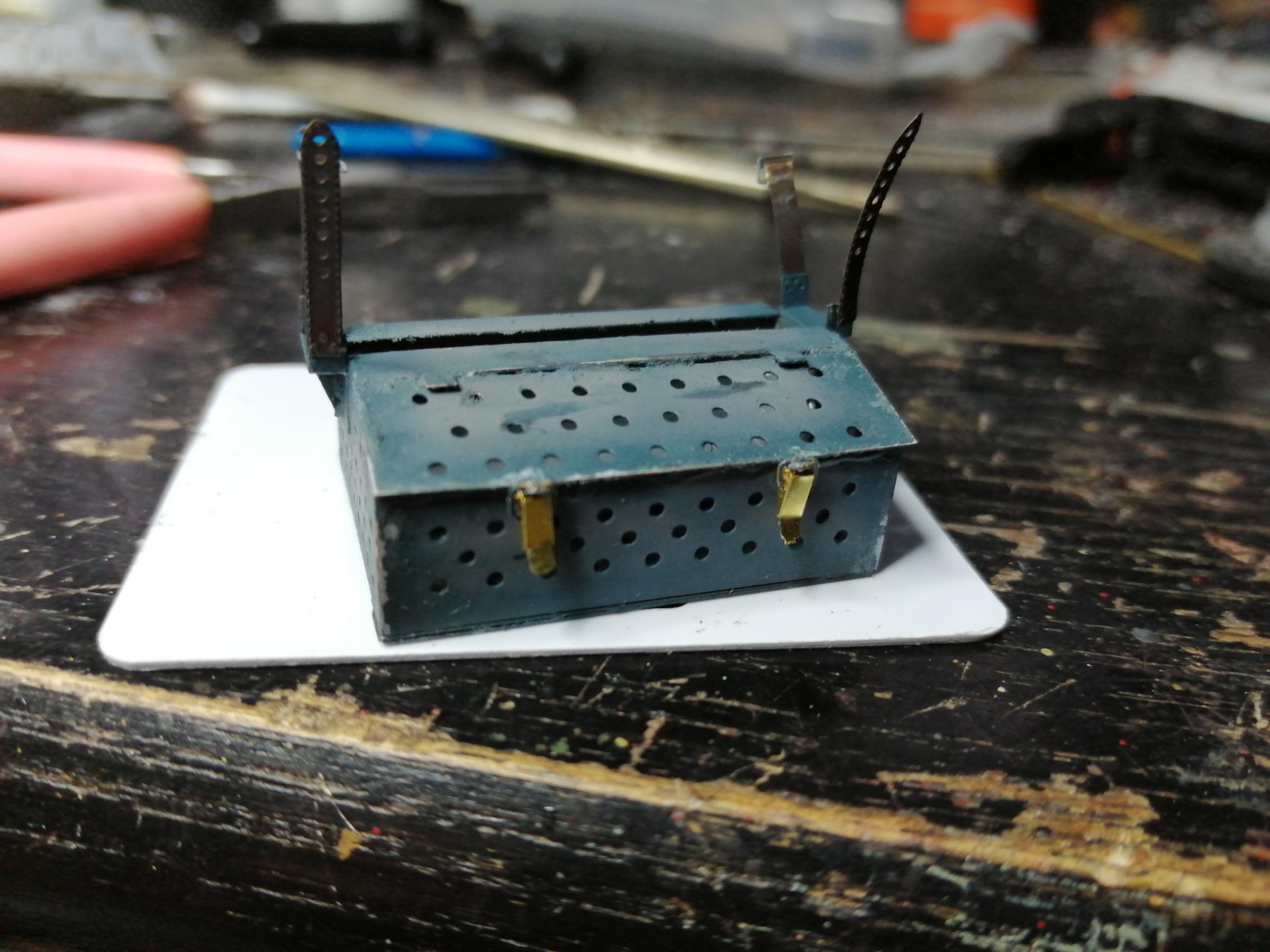 I have also been making up what I assume to be the tank's tool box. I was just needing 2 of the clamps to finish it offObviously the clamps will need painting to finish it off. All told, the tool box comprises 16 different pieces, held together  with a combination of solder and Gorilla CA gel.  The straps are for the jack which sits on top.  I think it is going to be fun threading and tightening them up!