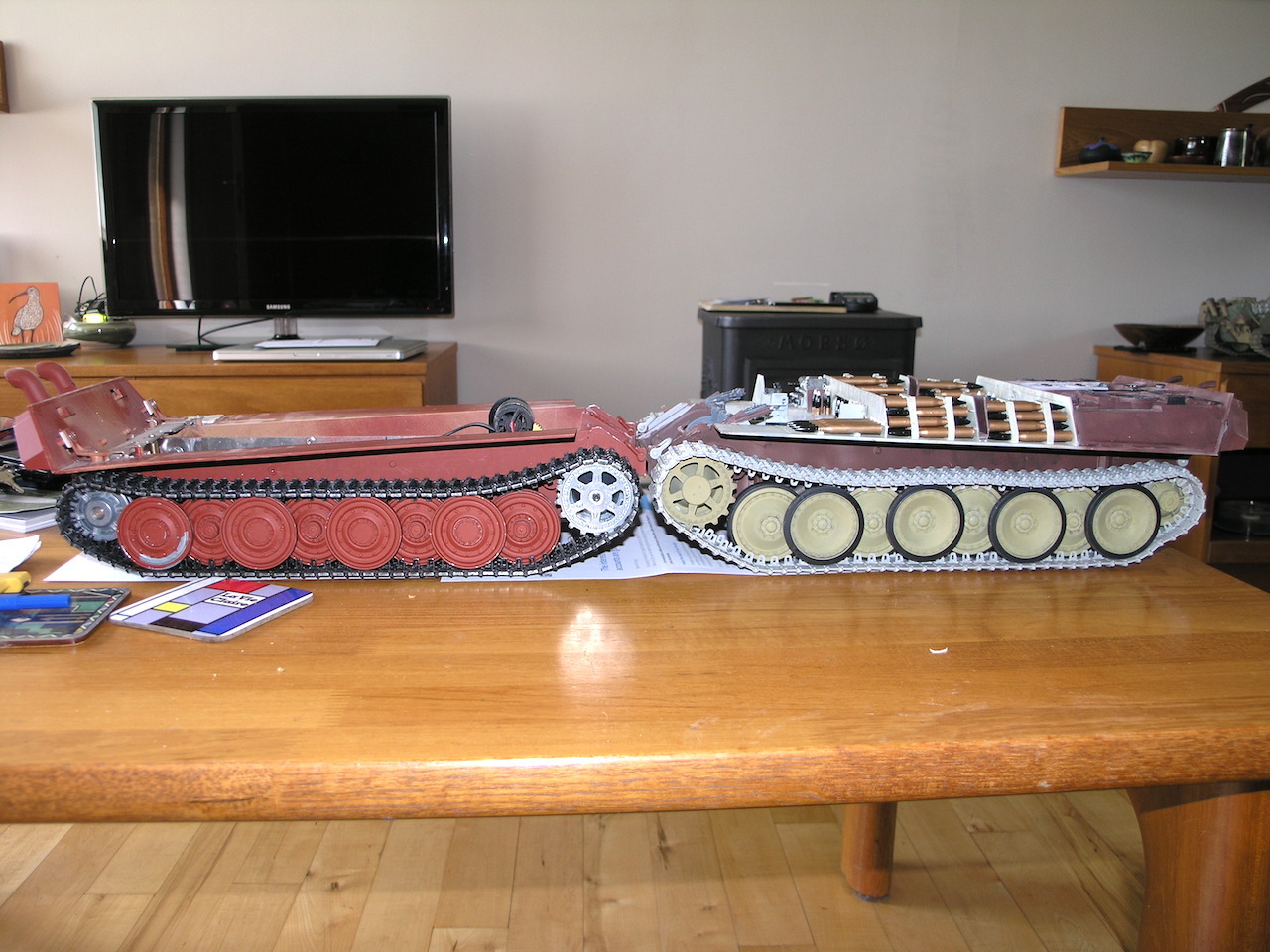 Think i might have to buy the stronger wire upgrade for the suspension it looks as if the hull has sagged. The HL panther was easy as the hull is plastic , changing the sprocket position on the Taigen will not be an easy fix due to the metal front.