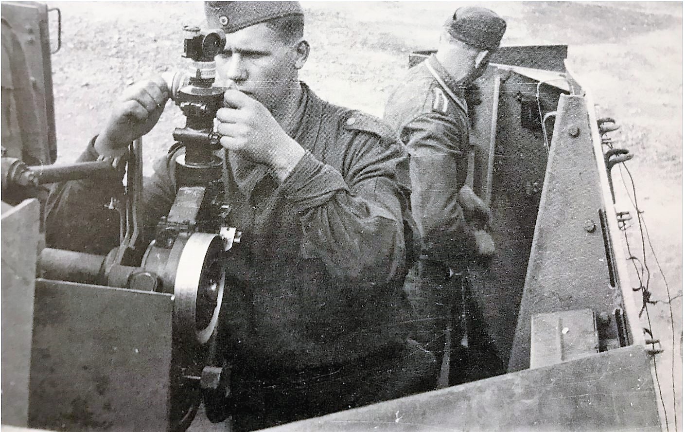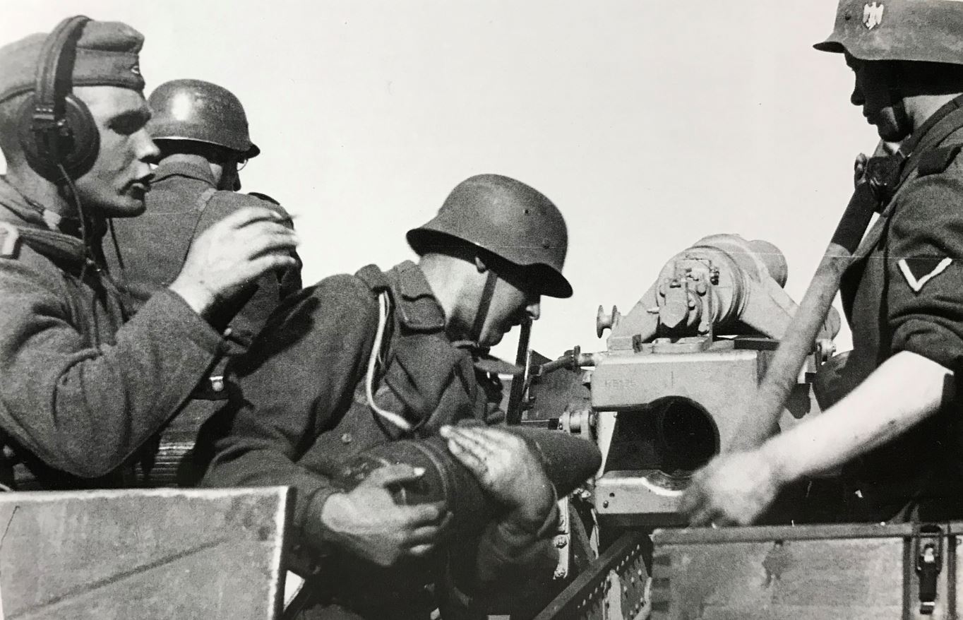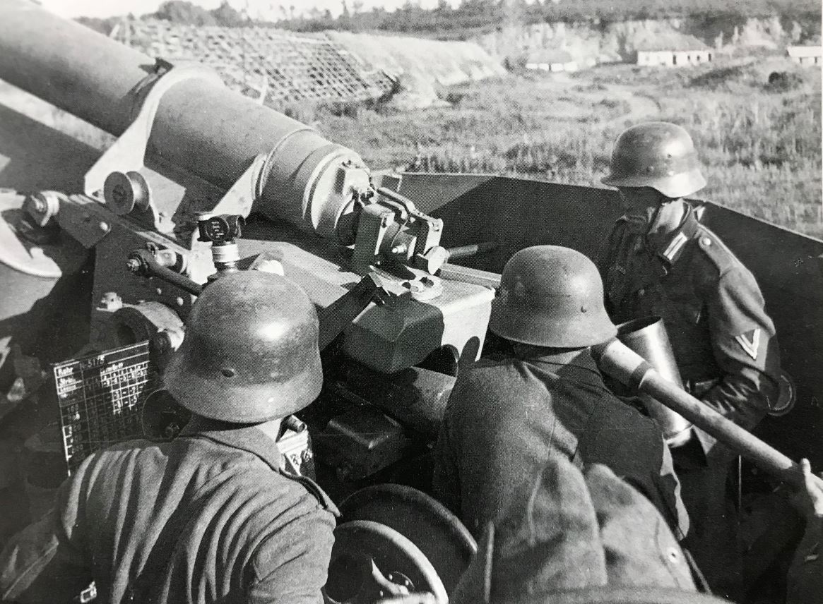 View of Hummel crews in action. They were equipped like infantrymen with infantry caps or steel helmets, not panzer troop uniforms. The ammo round handler is on the left, the crewman with the rod used to push the round deeper into the breech is on the right, the cartridge case handler is at the front right. This crew position was seen consistently in all pictures.
