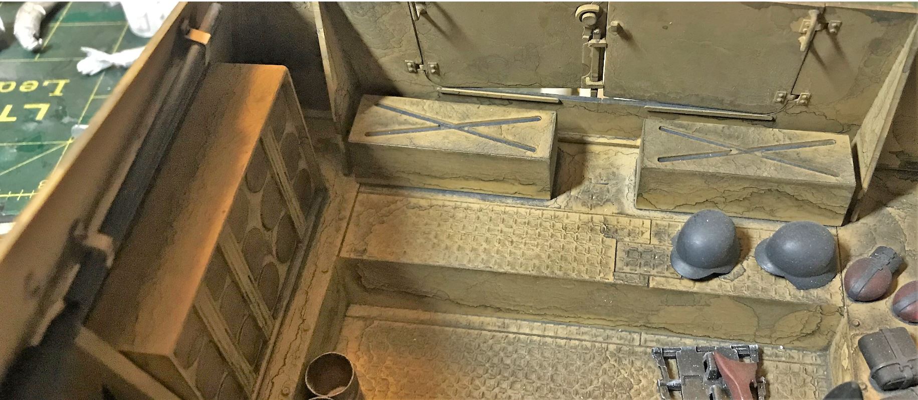Here is the finished interior. The inclined panel on the back right of the interior is the loose door panel for the ammo cartridge bin on the left, removed and positioned there by the crew when on a fire mission.
