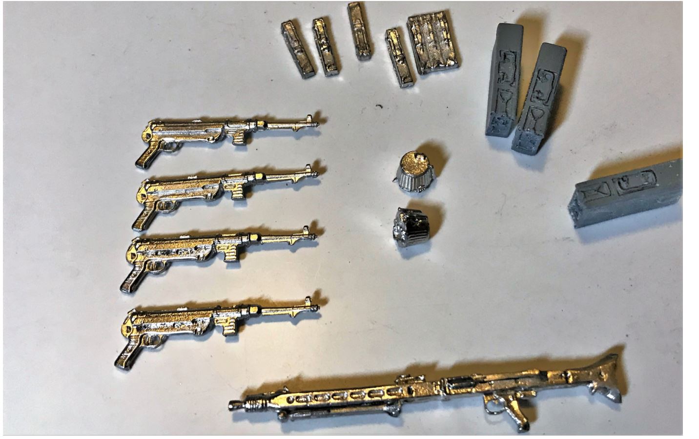 Starting the personal weapons of the crew. Four metal MP-40 sub machine guns and one MG-42 from Dioramaparts have been gathered and need to be positioned in their holders inside the vehicle at different locations, with mags removed.
