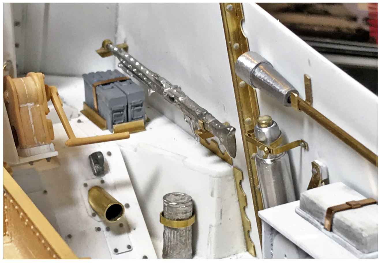 The MP-40 machine gun on its stand scratchbuilt with brass channel strips.