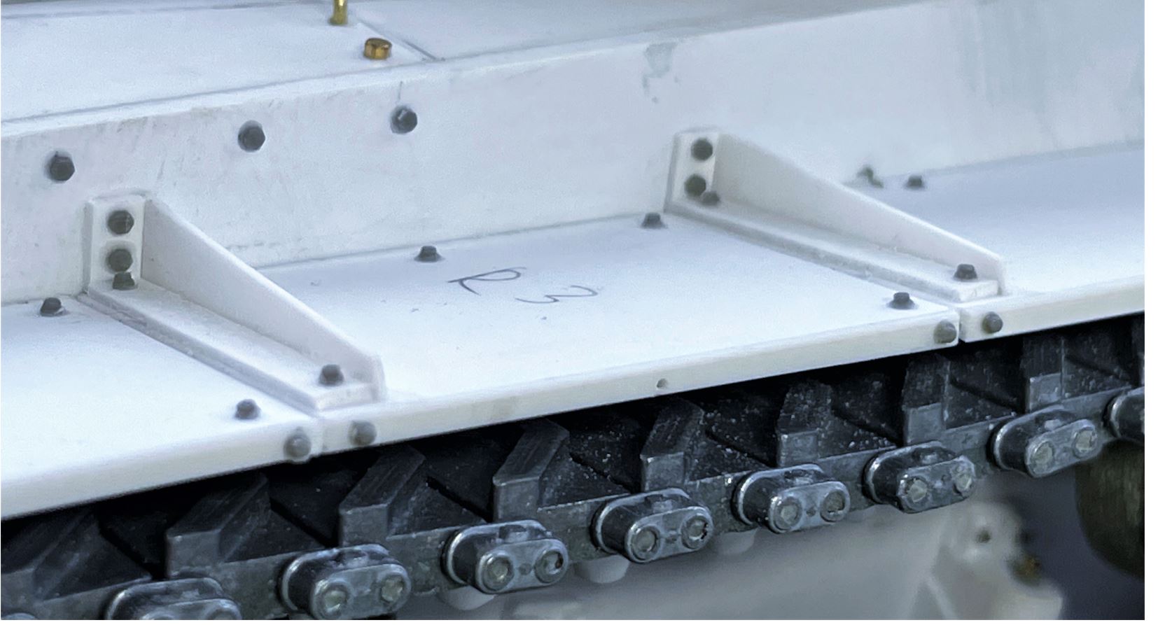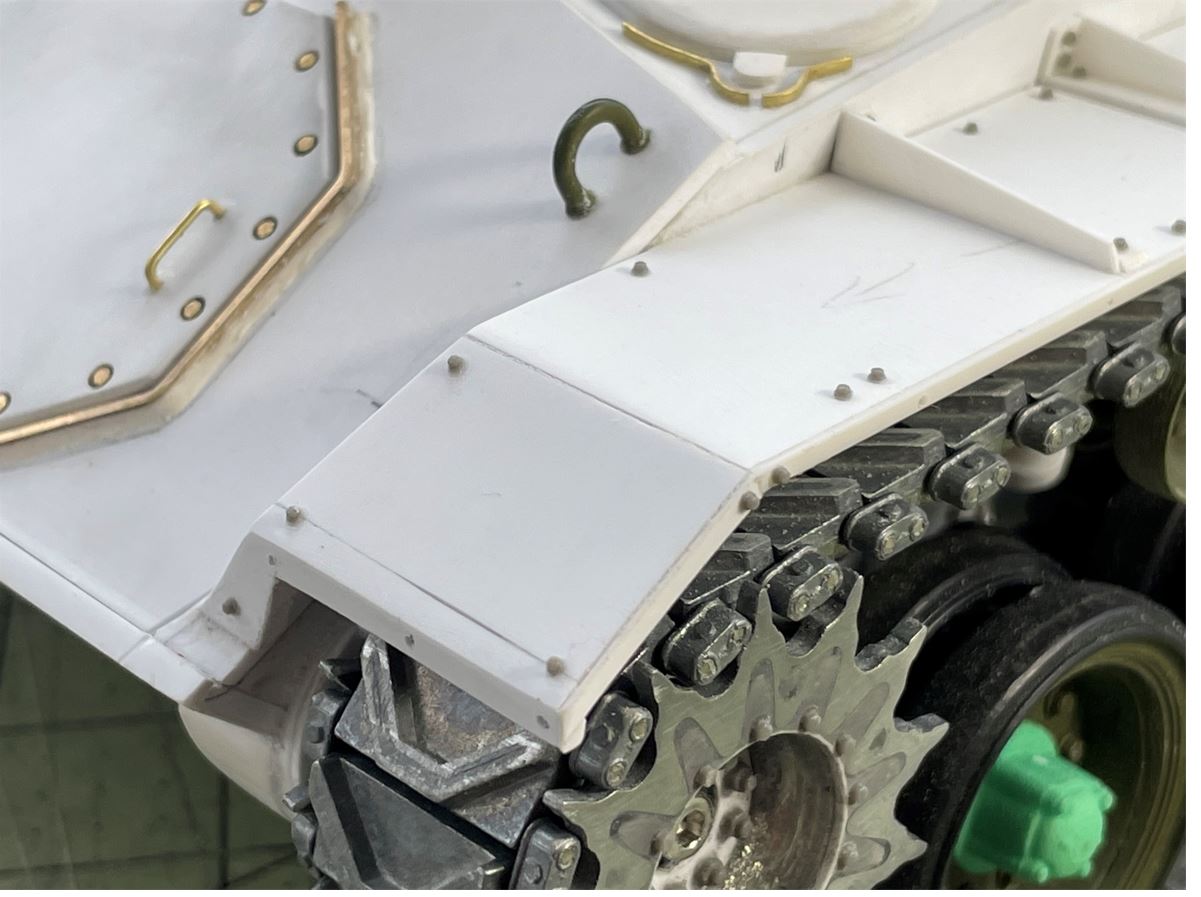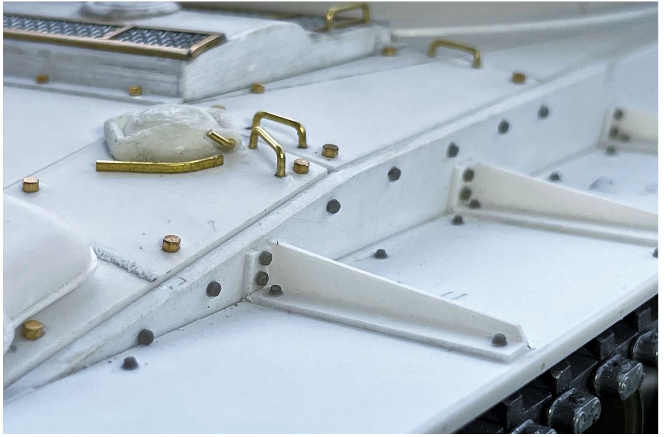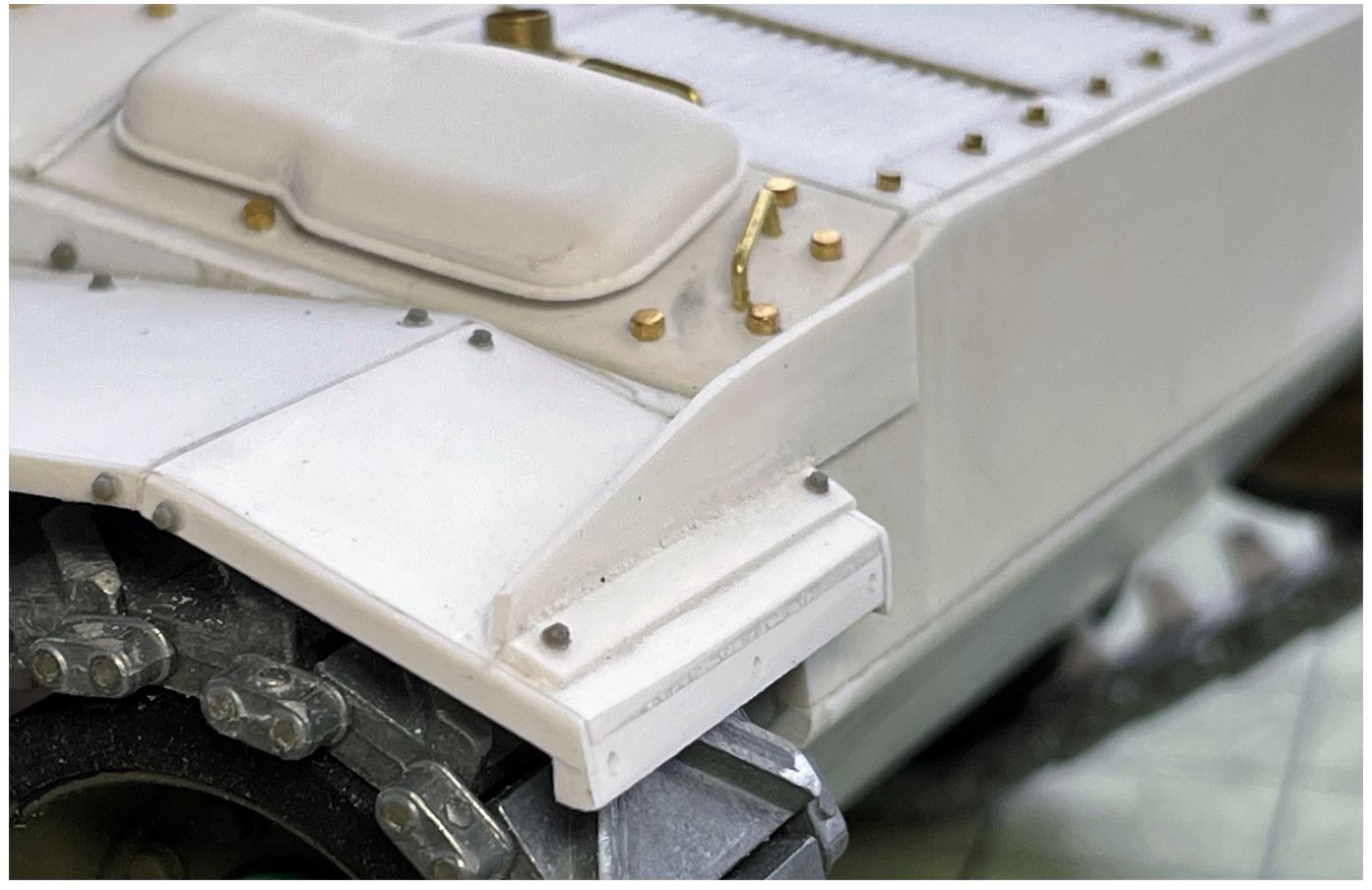 The Chaffee front fenders have a reinforced bracket that is also useful for the RC vehicle. A bit of a struggle here to get all the angles right, but no issue. The bracket was given a solid base underneath and glued to the chassis for solidity, that section was taken from the removable sliding glacis.