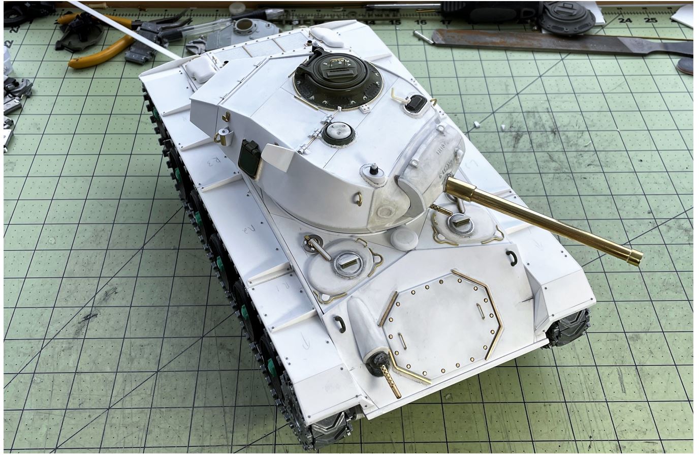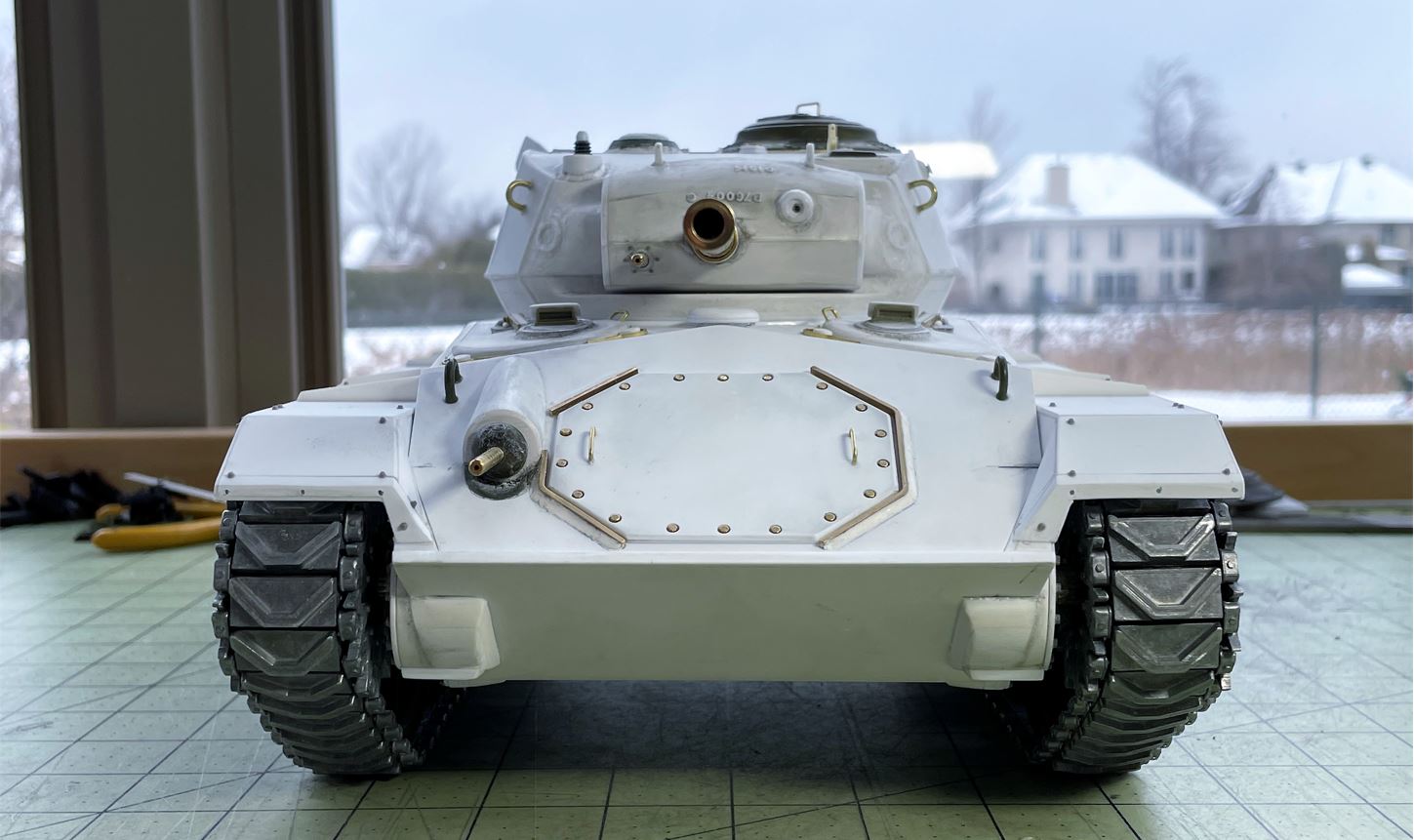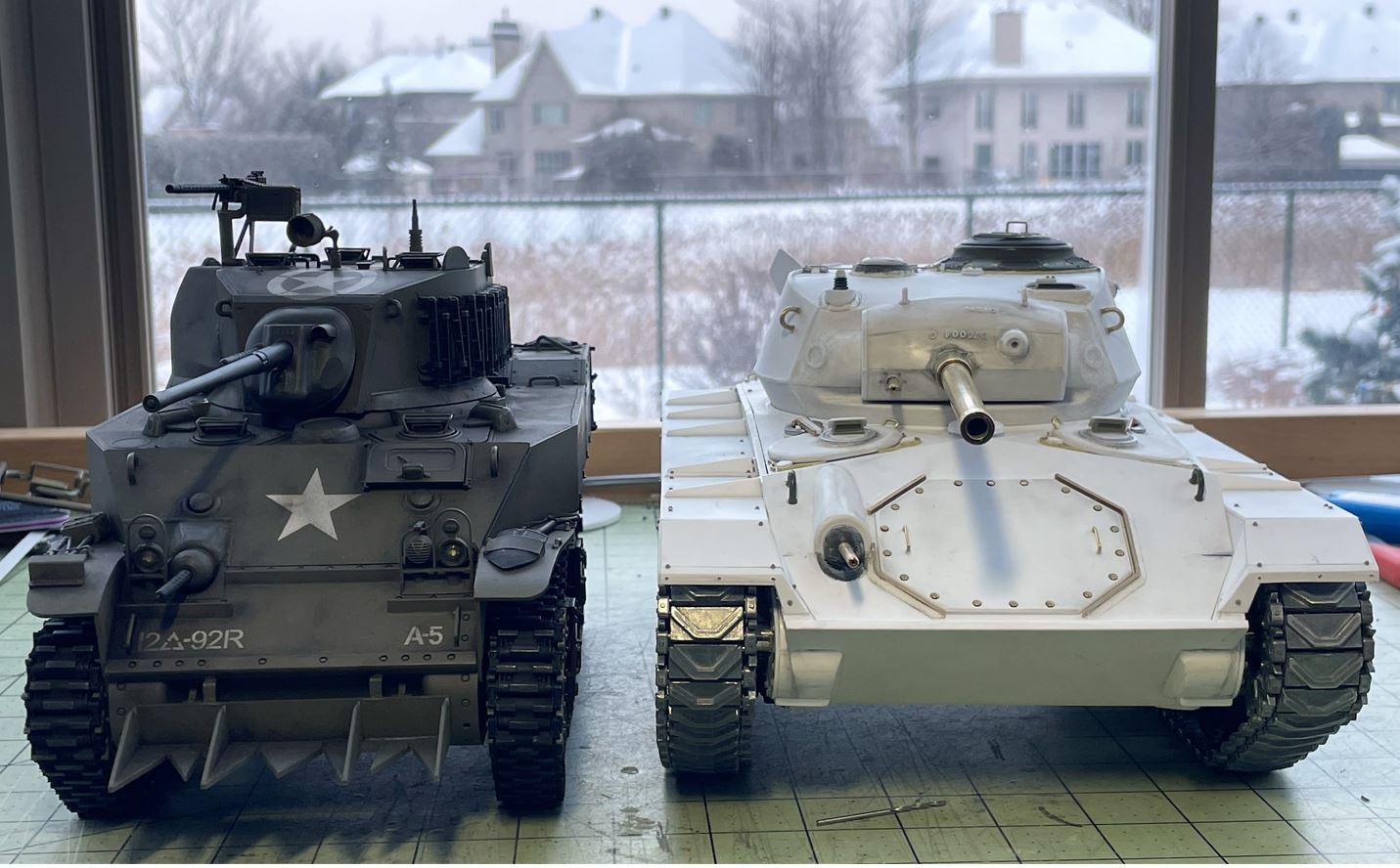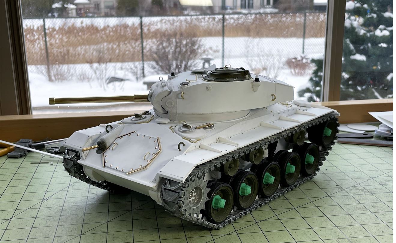 The model as it stands today with the turret put on the chassis. It is really starting to look like an M24 Chaffee on the final assembly line, a rare sight in 1/16 scale, and a unique model itself by the selection of components used.