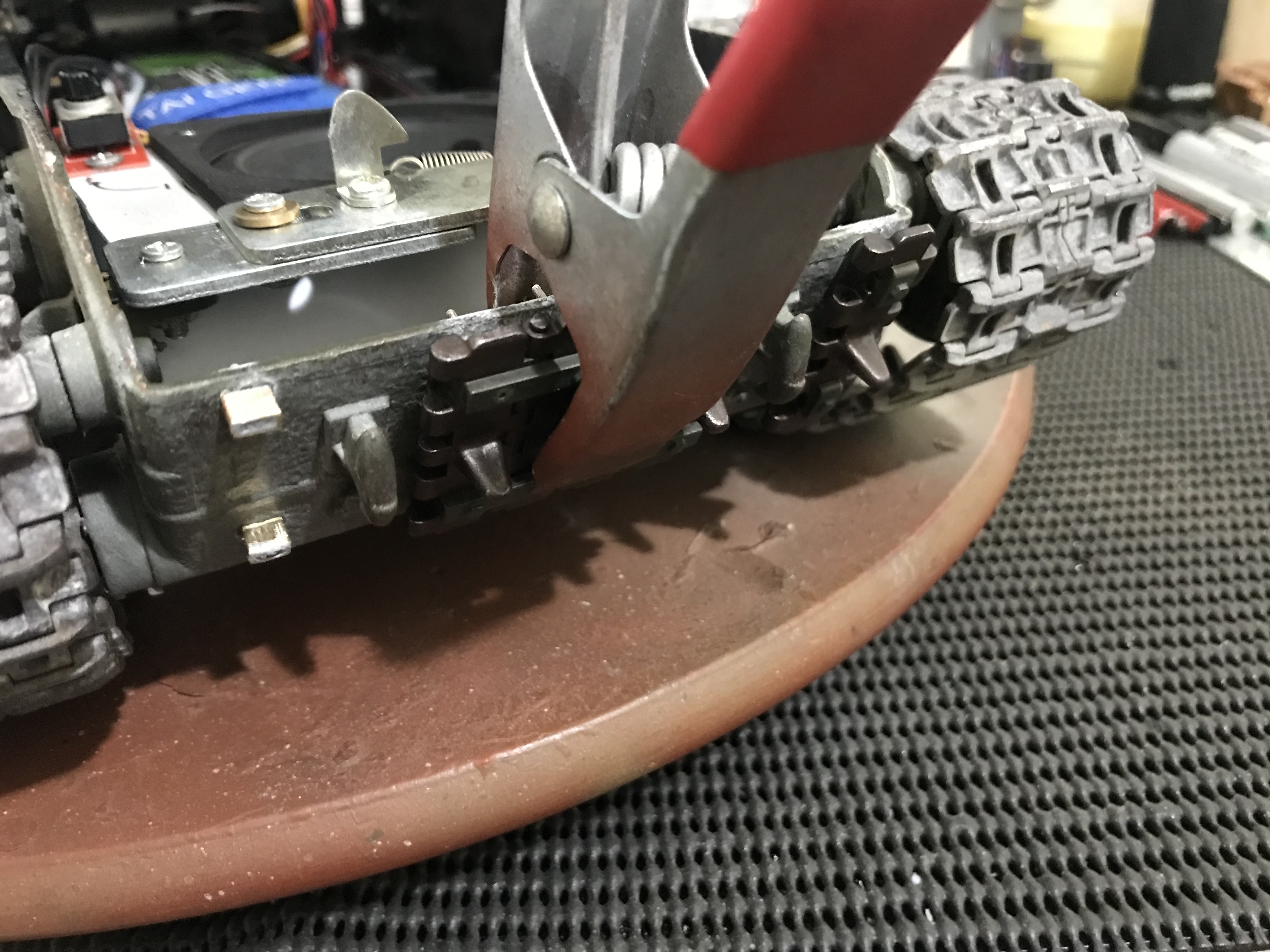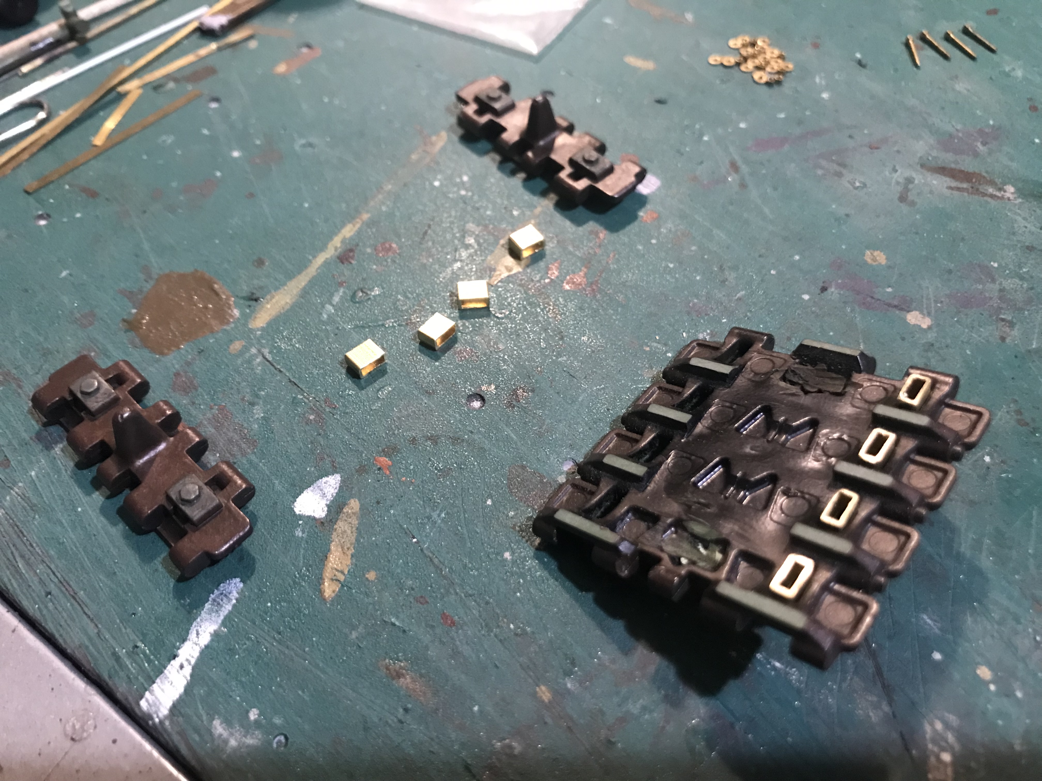 The plastic links will be reused, but secured on to brass rectangle with small bolts soldered inside the section, which is then anchored through 1mm holes drilled into the hull.