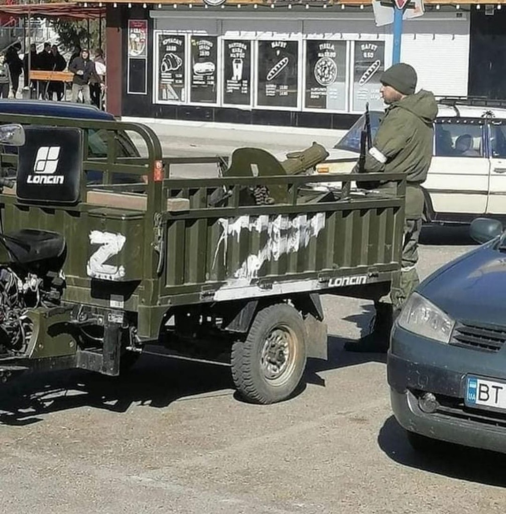 well, it is likely in Ukraine, according to the licenseplate of the blue car, but I doubt the Russian army is using that. So actually it should be a local who supports the Russians?
