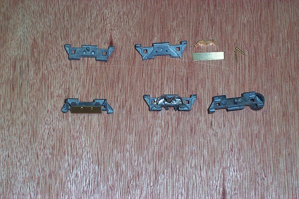 Here is a picture of what I am doing to put the brass grousers on the metal track. The track is made of Zink and Tin, so it will not solder or silver solder. What I am doing is drilling two small holes in already existing holes in the track shoe. I am also drilling corresponding holes in a section of brass strapping. I then put the two brass brads through the lined up holes and solder them on the inside of the track shoe so that they wont pull out and keep the brass strap tight against the track shoe. I then solder the grouser to the strapping. I recheck the brads to make sure there is enough solder on them so it flows into the holes and everything is tight. It is taking time, but I think it should hold and not break the track shoe like the plastic ones. I guess I have a job on my hands now.