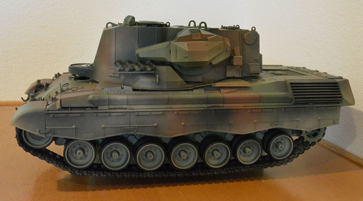This is Gepard Flakpanzer #2, an 8 channel model. It is a collaboration, custom fabrication build, with scratch built internals, captained by Daryl Turner and built for our mutual friend James. I researched and spec'd the RC Setup focusing on accurate sound effects. Then assembled the Tamiya Kit, painted the model and shipped it back across country to Daryl for the RC component(s) installation and setup. The model was completed April 2017.