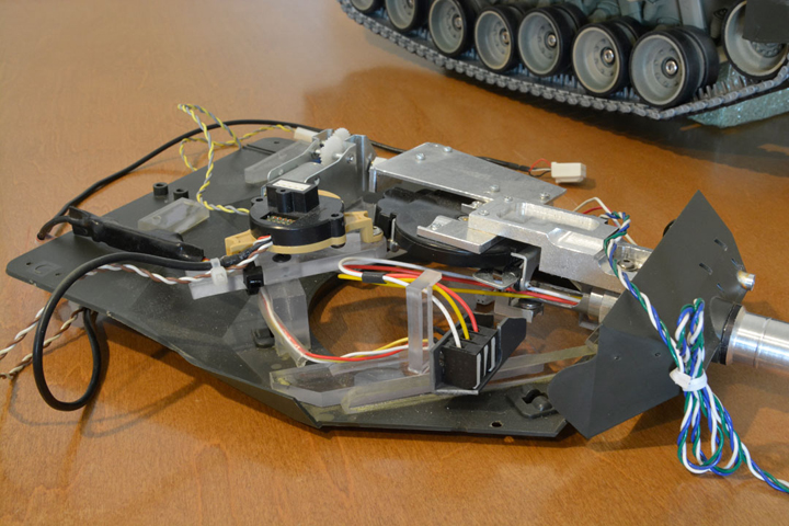 Daryl B. Turner explains the scope of the project in this brief: Features on this Gepard model that John is working on include, "Hinged upper hull, Heng Long turret rotation, servo drive for forward radar, servo drive for rear radar elevation/retraction, DC gear motor rear radar dish sweep (this turns on upon full elevation of radar dish), servo drive main gun elevation/depression. LED flashing barrels that are also detachable for shipping/storage, high speed vibration unit (shakes barrels to simulate firing and is located in the turret), noise maker (makes metallic sound of shell ejection during firing, and is integral in turret as well), BARC electronics, Benedini sound, dual speakers, Futaba 8J transmitter, ETO gearhead main drives, full ball bearing wheels, modular wiring harnesses, Henntec idler arm upgrade. Also has extensive added bracing on lower hull, rear panel had been reinforced, and sponson extensions added (covers the gap over the track). This is completely serviceable with basic tools, all components attach with screws or custom hardware, minimal glue used on mechanical components or items that need access. I’ll do photos of the re-installation of all of these mechanisms when the tank is returned to me for final fitting and tests/adjustments. I shipped the tank only as a shell to John, I did not want to risk the damage during shipping of the delicate internal parts I created."