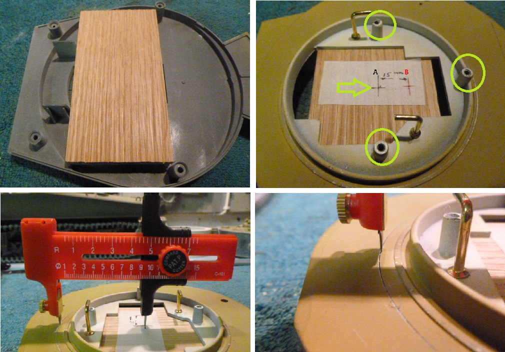 1 -Mark the centre Point A and 15mm backset Point B on timber screwed to Hull.