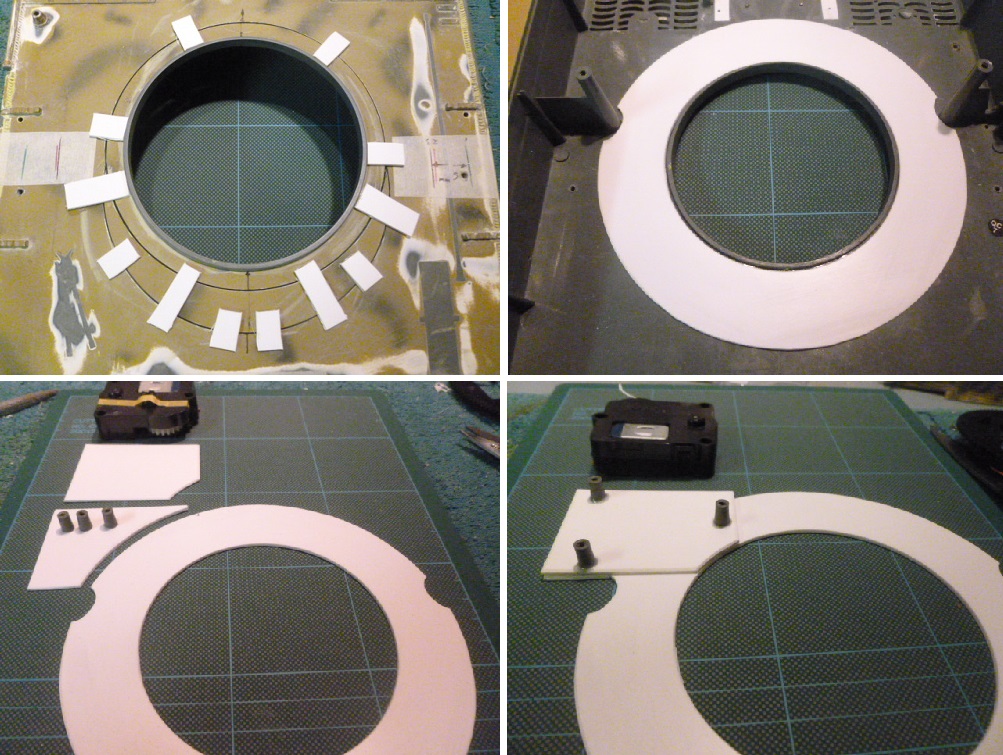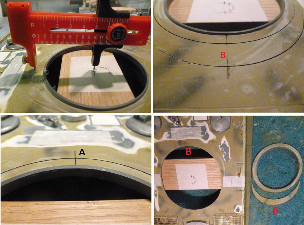 The basic principle is to repeat the same on the Hull that was done to the Turret base.You are going to remove the centre section of the Hull Turret ring opening and move it 15mm rearward. The proccess gets a little more complex as you will have to fabricate new Turret drive motor mounts but it it straightforward.