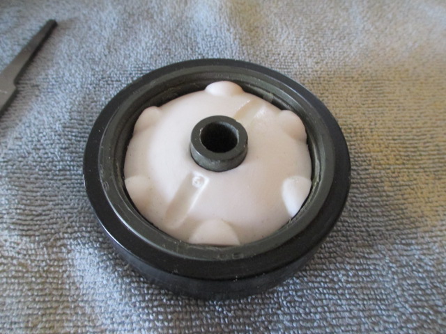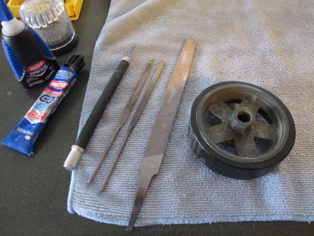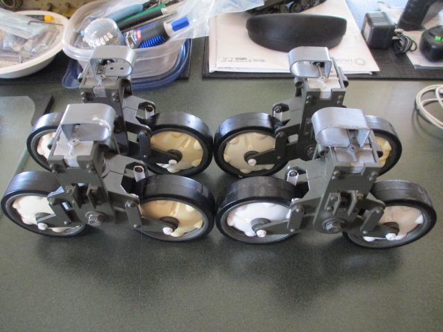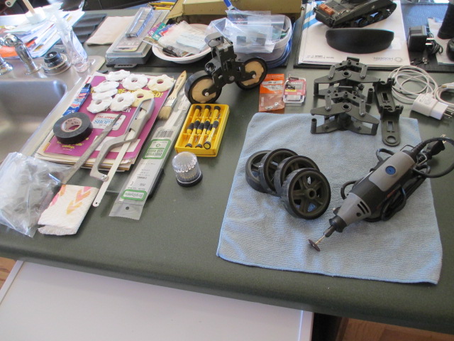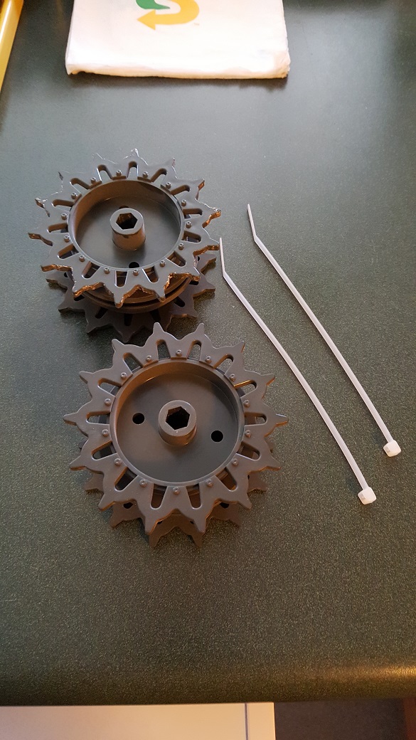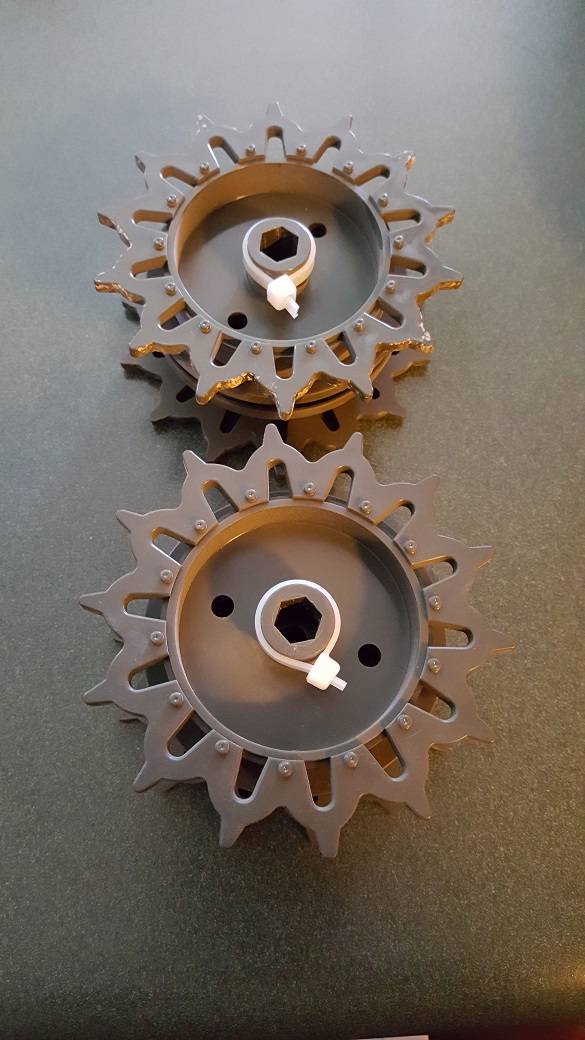 After work and before supper, I did a spray test with a couple of products that I thought might hold promise as brush on coatings for the Stuarts plastic road wheels. I'm thinking that the rubber bumper paint is the way to go as the undercoating smells horrible and still isn't dry. ;o) I also did a simple fix to keep the sprockets' shafts from cracking while in use. They are not the stoutest pieces and any help towards longevity is a big + Pics: