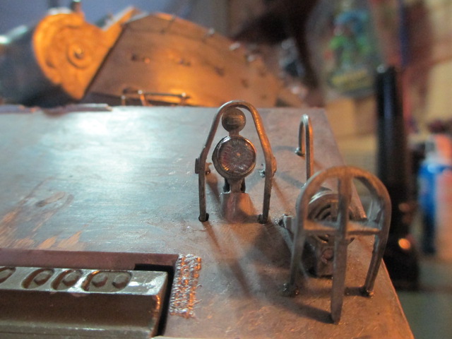 John, I'm crossing my fingers that they perform as I hope since they really do look good on the fixtures. Herman, I bought a Tamiya Diamond File to work with brass. It does a great job on this mystery metal as well. No issues drilling where needed tho' the standard Pin Vise drill bits are only used to make starter holes for the carbon tipped ones. To make up for the small amount of work performed yesterday, a great deal more detailing was done up tonight. ;o) Pics:
