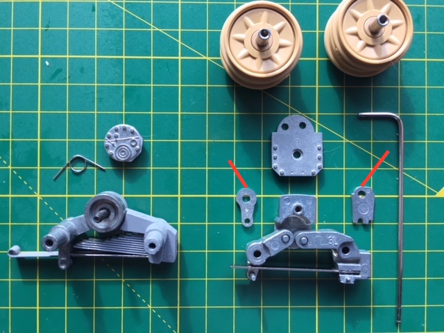 Below, indicated by the red arrow, is the dread retaining clip Taigen, Asiatam (and presumably) HL use to keep the spring 'Leaf' assembly in place. Here we are looking at the plastic floor of my Taigen Winter ed. Pz IV. When it arrived, clips were missing, and two were adrift...and that's before I even started it up for its maiden clank. :-<
