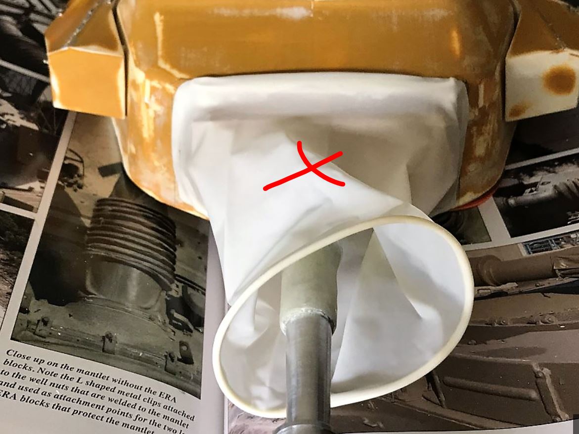 Although easy to handle, it was a bit too small and I had to stretch it too much to fit the large mantlet. Too thin, it did not show correctly and was too weak at the corners of the rectangular mantlet, a small tear and it was over for this experiment. In any case, it looked like I was putting a condom over the mantlet, that was real ugly and an insult to a Centurion. Might be ok for other tanks...