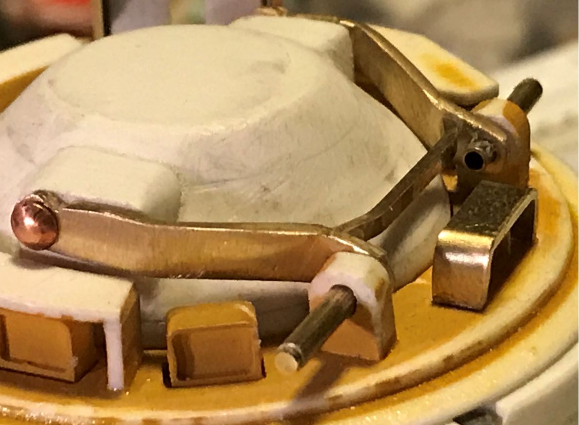 I was not able to fully reproduce the shapes of the arms for the cupola hatch opening mechanism, they go high and the required thick brass would have broken if I bended it further. But they look ok and are functional.