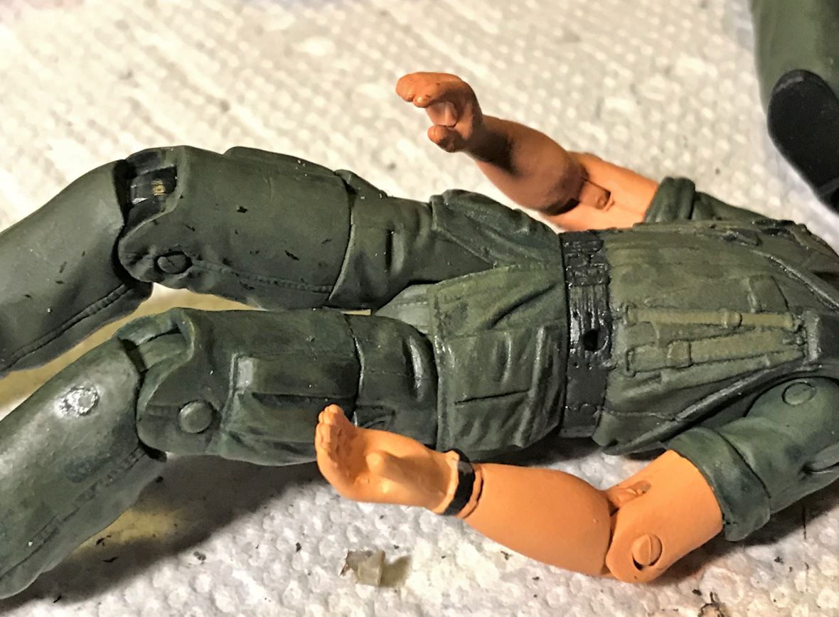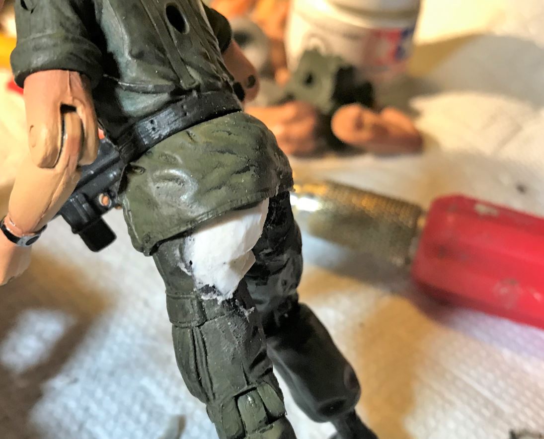 The arms are then superglued to the torso in the required static position. Notice plasticard pieces to recreate the knees.