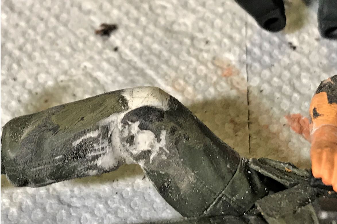 Sitting or standing soldiers on a tank need to press against the tank armor. In order to replicate this correctly, the Dremel is used to remove material that connect to the tank. Here, a flat bottom for a sitting position.