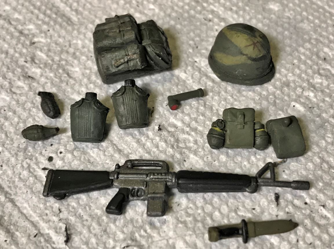 Here is the personal equipment of a rifleman in Vietnam. This M16 came with the tank crews purchased separately and is of a better quality than the M16 that come with the infantry figures. However, the quality of 1/18 scale weapons is nowhere near what is available in 1/16 scale, too large to use here.