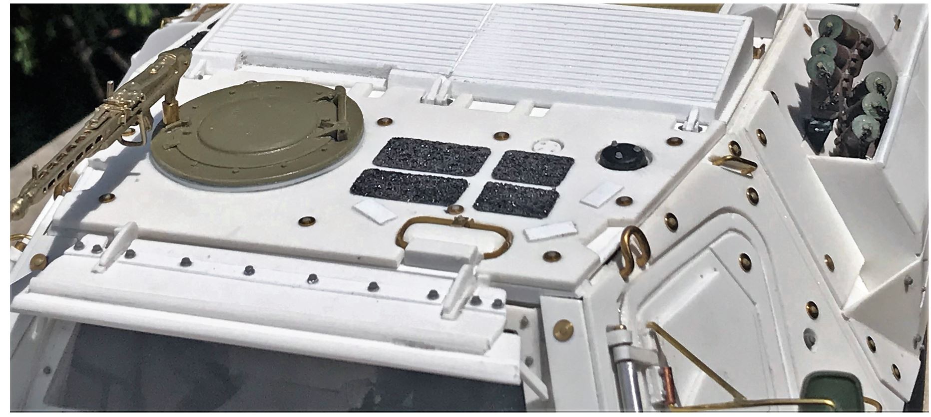 With today's shipment arrival from Knupfer in Germany, I can finish the add-on anchor points all around the vehicles. These small roundels can be found whenever the applique armor is present. I found these anchor to be highly visible and worth representing. It is a good idea not to underestimate their numbers. There are at least 150 of them and once you start putting them according to reference, there is simply no stopping. The only area I did not put any (yet) are under the vehicle and the inside the road wheel wings. I would have to scratch build the add on armor for these areas first, and not sure it is worth it.