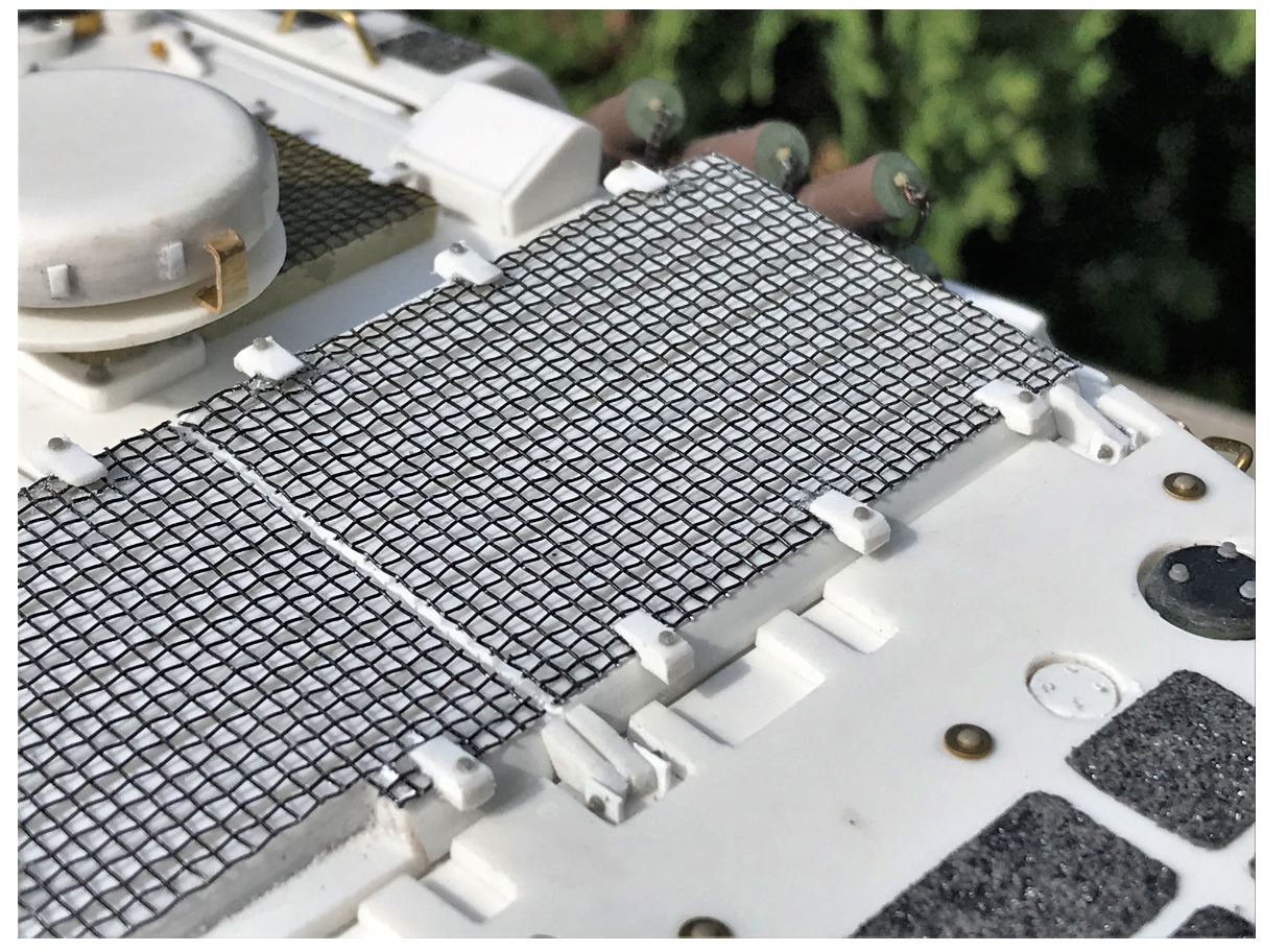 I was waiting for a hobby mesh screen from overseas to finish the engine grills. But as I was replacing the metal screen on my sliding patio door this morning, I realized that the leftovers were as good as anything I could find on the hobby market. The thing is that instead of paying $20 (screen and shipping) for a few centimeters on the hobby market, I got 2 square meters of fine grill material for the same price at the hardware store. Even with just the leftovers, I have enough screen for a lifetime of 1/16 engine grill modelling.