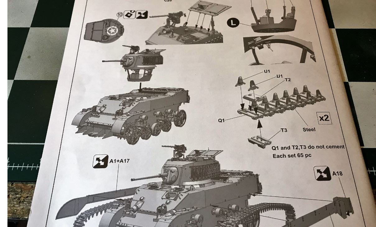We do seem to have the same taste in tanks. Got two M5A1 for exactly same purpose. This kit is full of standard US equipment for a builder’s spare box that are costly when found individually. In addition to the complete 37mm gun and US tank radio, it has a 3 complete M1919 machine guns with ammo box and different mounts, a full set of tools with PE attachments, a Culin hedgerow cutter, 16 US periscopes with mounts and guards, tie downs, head and tail lights, horn, search light, fuel caps, tow hook, turret seats and lots of other stuff in addition to individual track links, ice cleats, wheels, etc. Only missing crew and personal equipments really. I can see myself buying more just for equipment.