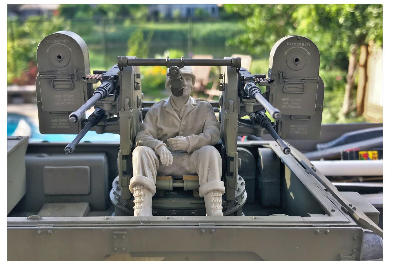 Dremel time. To fit the M45 quadmount limited gunner seating space, minor adjustments are required. Need to give his back a slope matching the quadmount seat inclination, cut a bit of the feet and calves to fit in. The left arm, freed of the little girl, is repositioned towards the inside. Residual resin pieces are cut and put into the gap with superglue, then sanded.