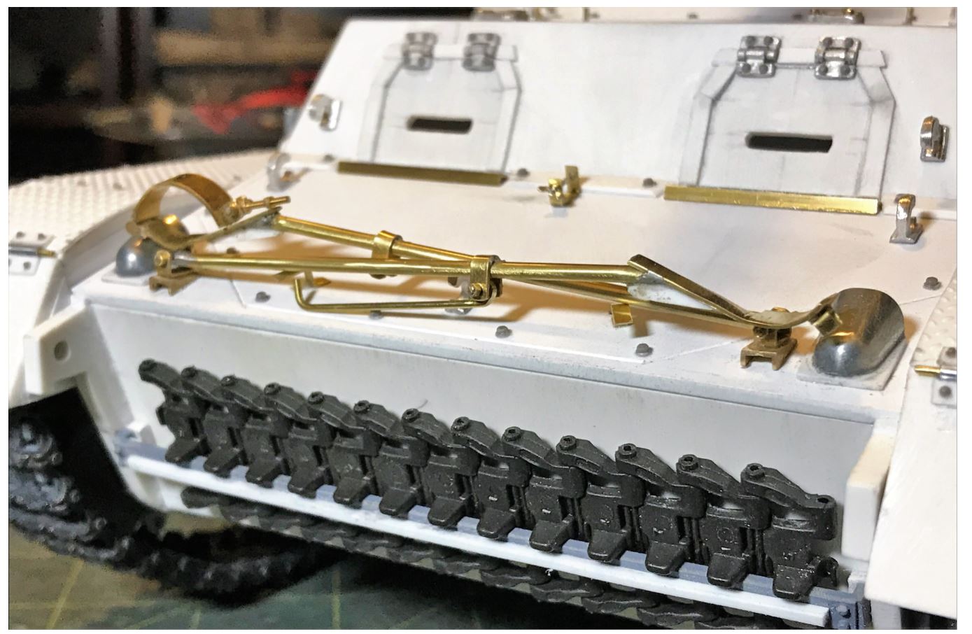 Last thing to do was the addition of the tie-downs around the exterior armor hedges. These are made in 0.5mm brass rods, and the real thing designed to attach the rain tarp all around the open fighting compartment.
