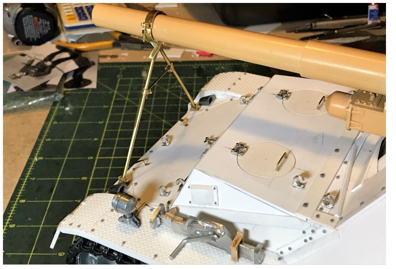 A lot more complicated to do are the bars for the gun barrel travel lock. And they somehow need to be made functional because showing them raised is an important feature of the Hummel. I knew it would be difficult to get them perfectly right so i set my expectations for results that would be close enough, with a few hours of work.