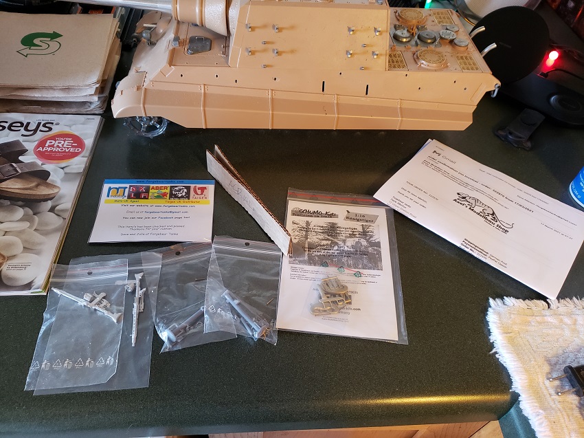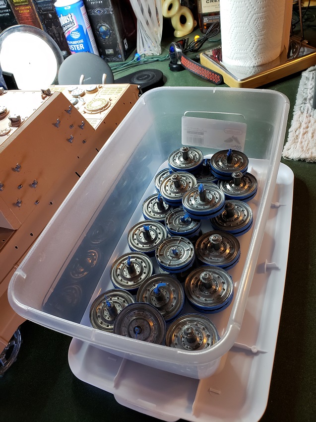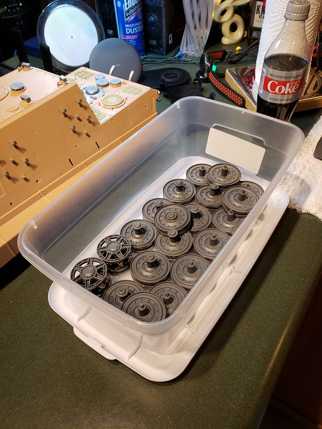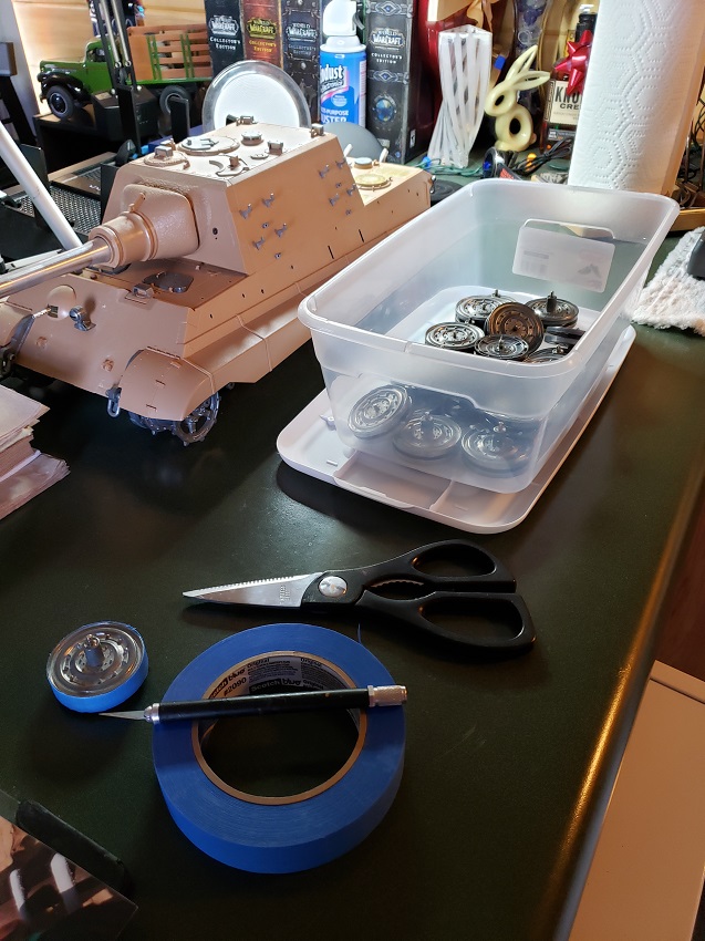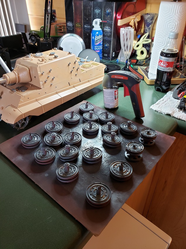 I have been ordering parts and pieces for the Jagdtiger and finally got to the point where I admitted ( to myself ) that waiting for things to come in the mail was just an excuse to sit and brood. My Boy Jack is asleep in my heart now along with everyone else that I have lost and it is past time for me to get back to living. Today I washed all the road wheels and the idlers and taped them off for primer and paint. I looked over the amazing little MG stand for the rear deck and am pleased with it's functionality. More fun soon.
