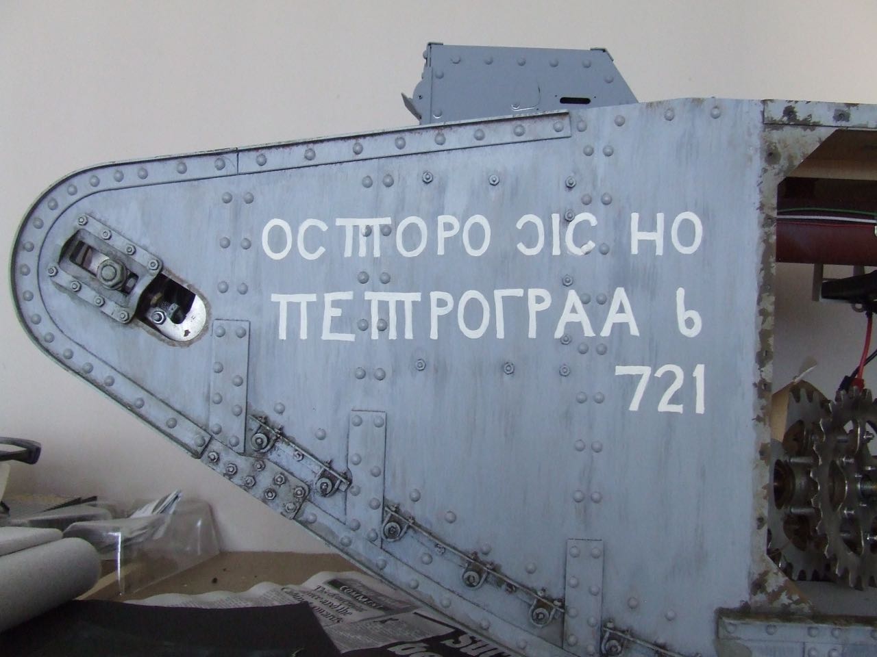The Scheme I am going with is as they left the Factory. It is an all over grey primer with some very badly written Russian Cyrillic on the sides. The cover story for the 'Landships' was that they were being built as motorised water tanks. The Russian writing was to throw the spy off even more by hopefully making them think they were a gift to Petrograd in Russia.