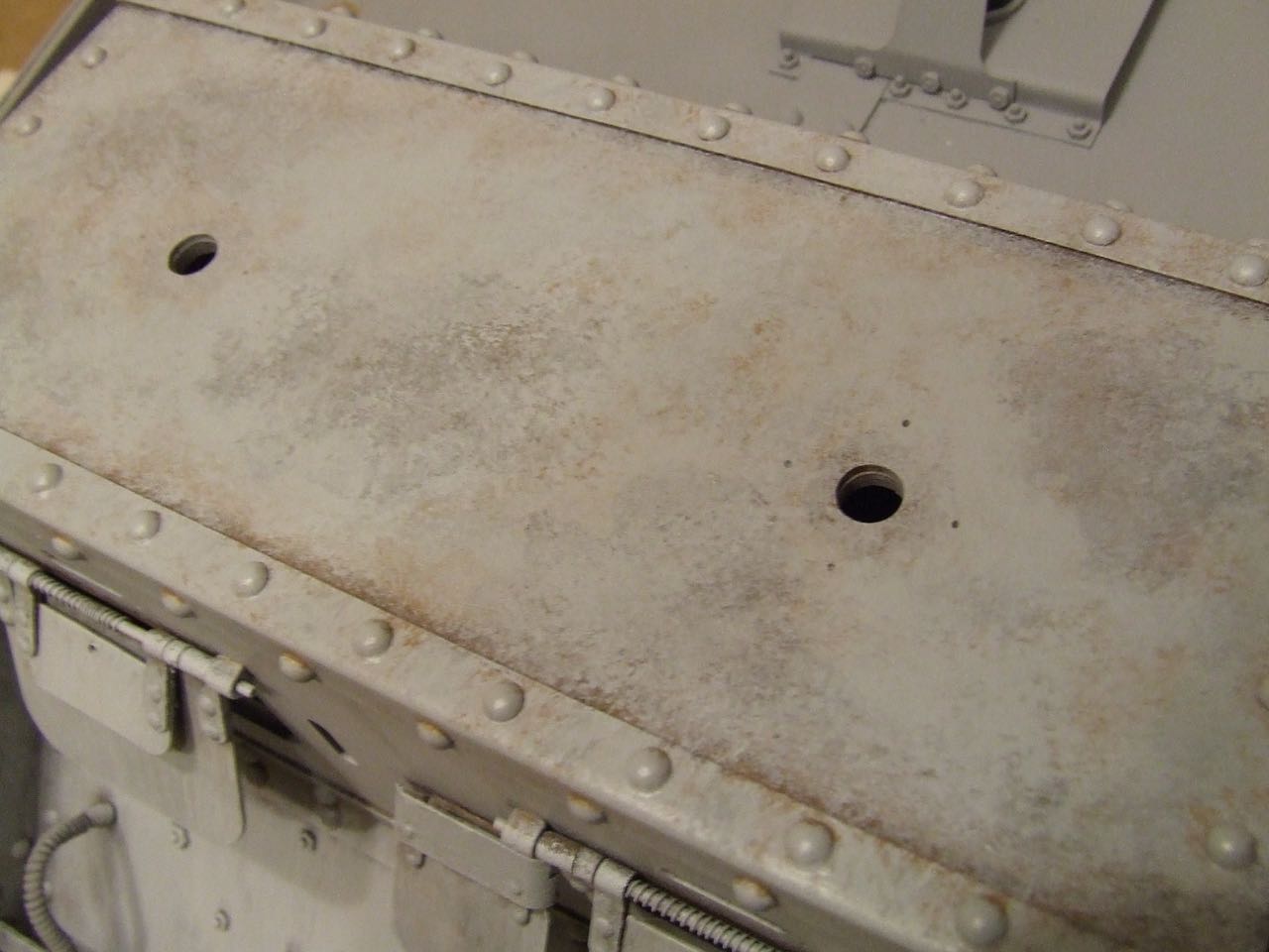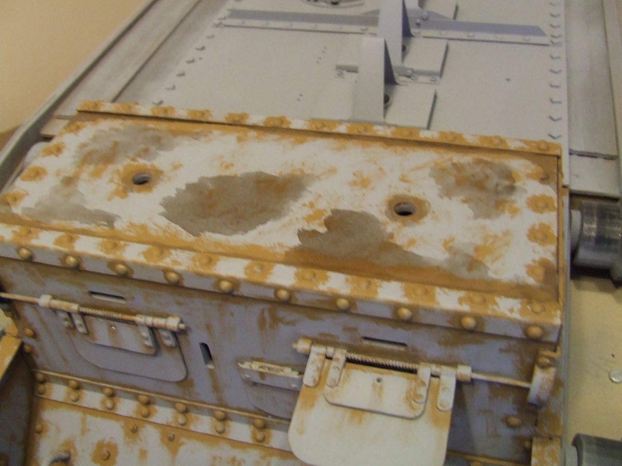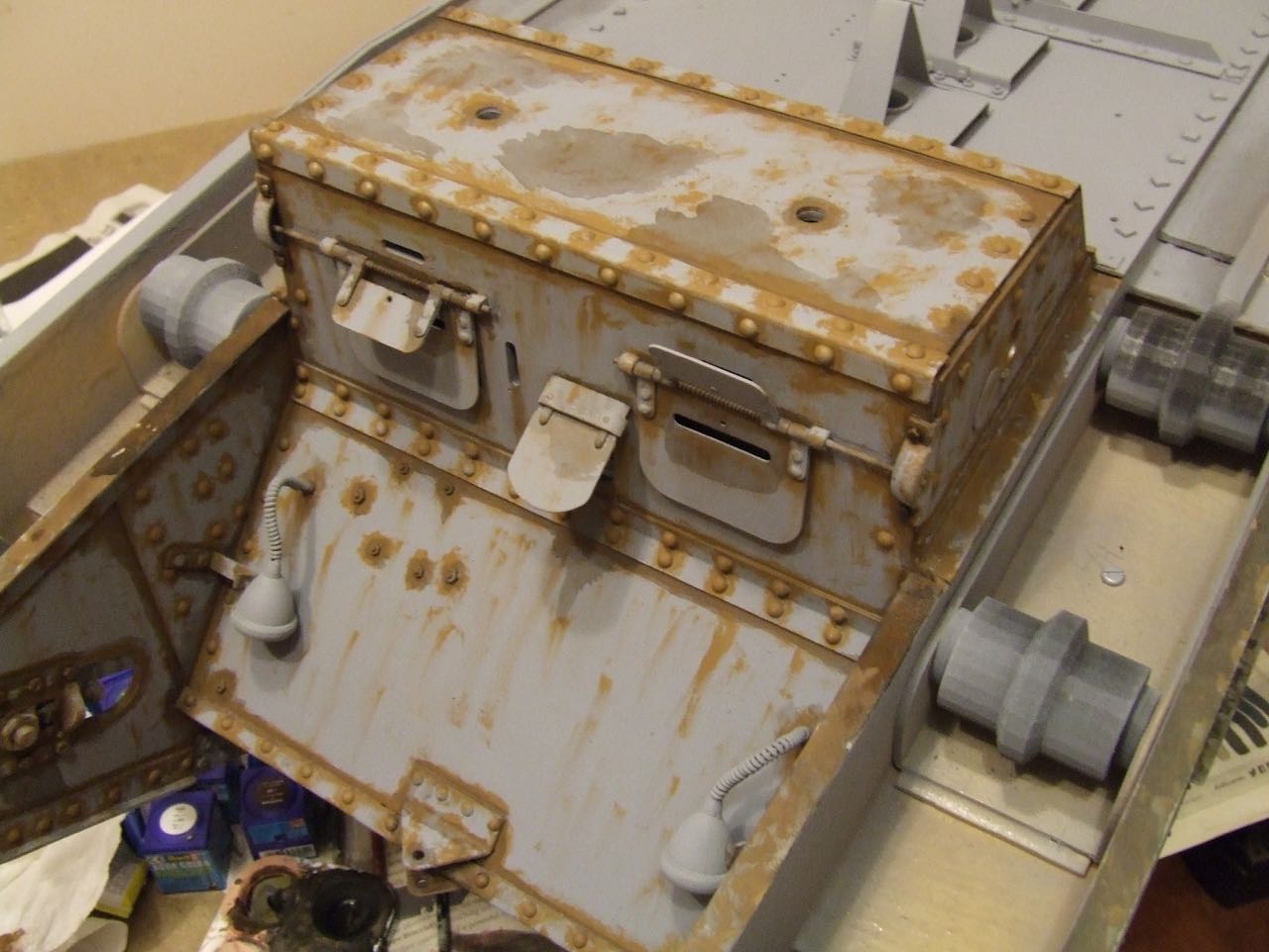 The Model was given a coat of Halfords Grey Primer. It gives a good base coat and is a shade darker than my final top coat grey, this will help with weathering. I work work with acrylic paints so I tend to go with pre-weathering which looks way over the top and tone it back down with progressive layers of paint. Then there's washes and chip techniques to stop it all looking the same. Also I will vary the technique depending if the area is vertical or horizontal. Stippling on horizontal areas like the roof and streaks on the vertical sides.