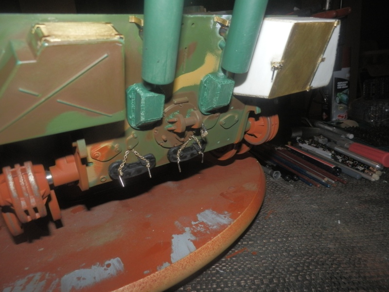 Drilled the mounting pegs with a 1mm drill & set thye chain links on to each pin. Locked on with a spot of super glue & placed on the rear plate.