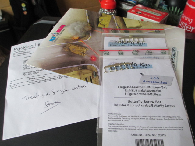 The post came in yesterday with goodies from Welsh Dragon. A tip of my hat to Steve for getting stuff here so fast. With these little pieces of art, I can complete Step 18 and move on in the build. I ordered another PE tool to enable me to build the little brass wingnuts in the ABER sheet as well. I want to use those to dress up the mudguards. Pic: