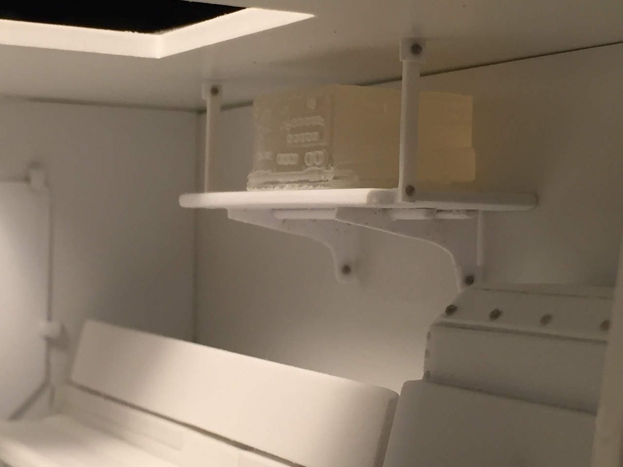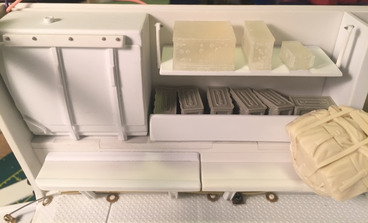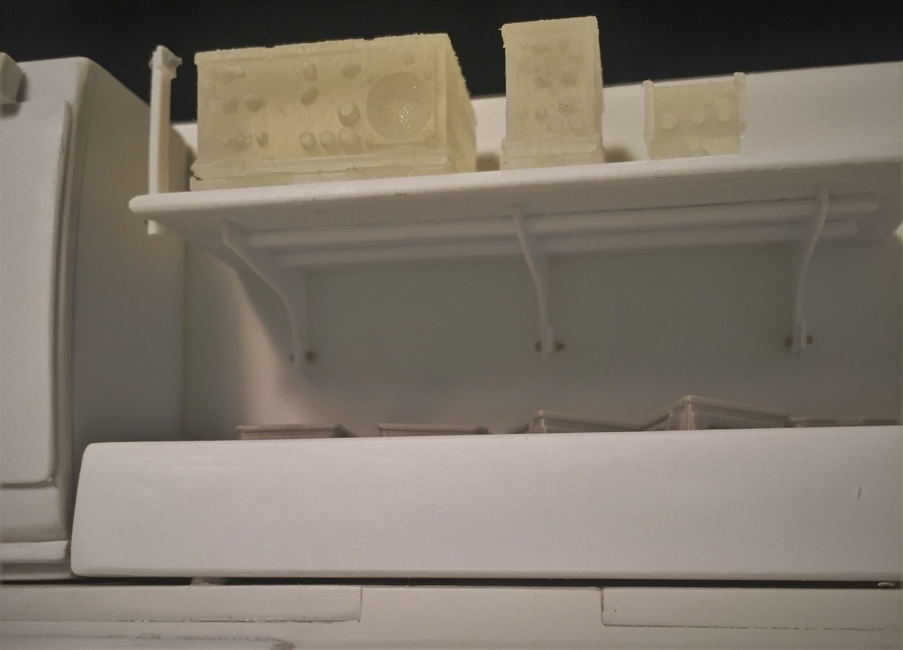 The radio set is only temporarily put on the shelf. It will be installed permanently only after the interior paint job (foam green color). The whole radio cabling arrangement will be created then, along with the AN/VIC-1 intercom set, with switch boxes, speakers and connectors running around the interior. That will be fun. This is important as it makes the interior come alive. I still have to figure out the interior lighting systems, with red and dimmed white.
