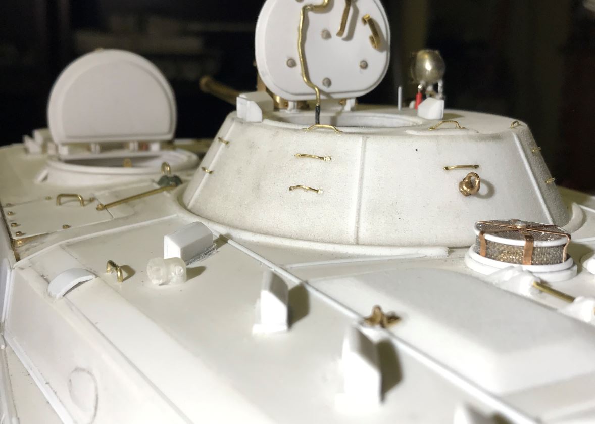 This is a Shapeways T-55 positioning light used on the BMP as well, a rare luxury to find this item available on the market. Need 2 at the back, 2 in the middle, more at the front. Also used a T-55 hook from Dioramaparts, modified to look similar to the ones used on the BMP at the rear.