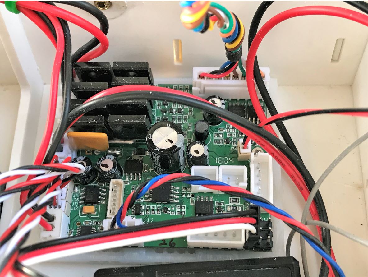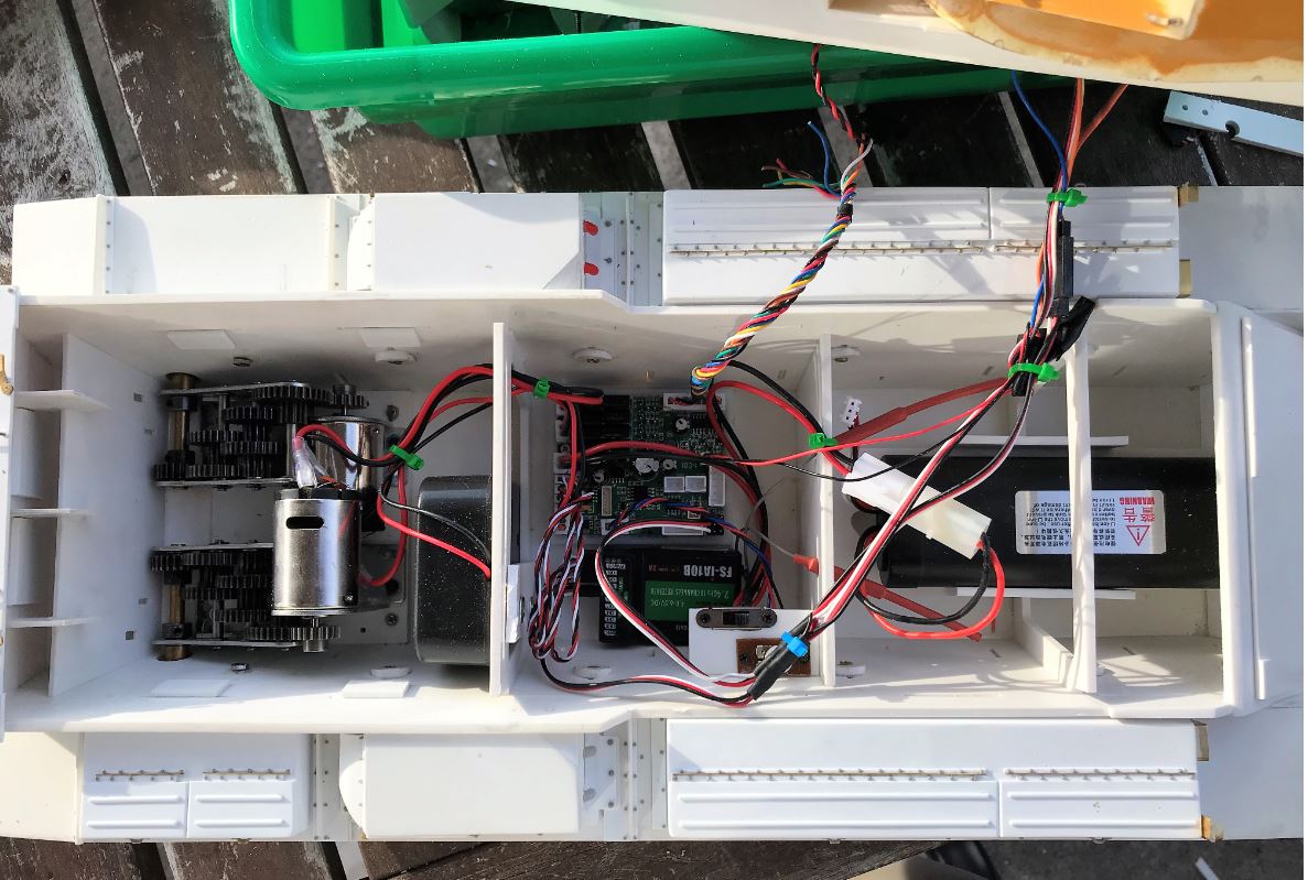 Overview of the electronics under the hood. Nothing fancy here; Mato gearbox, HL speaker, Clark TK-22 control board, Flysky 10 channel receiver, HL switch, HL volume control and a bulkhead and battery tray at the front.
