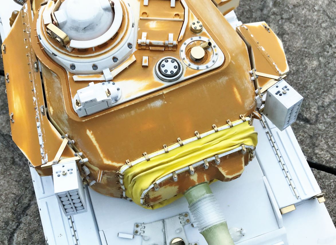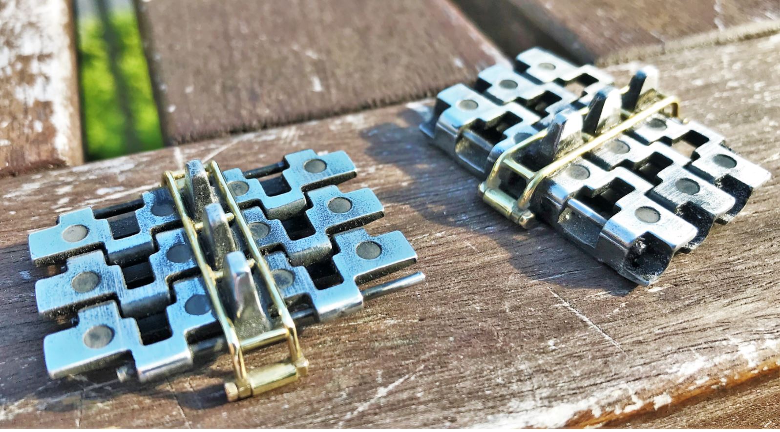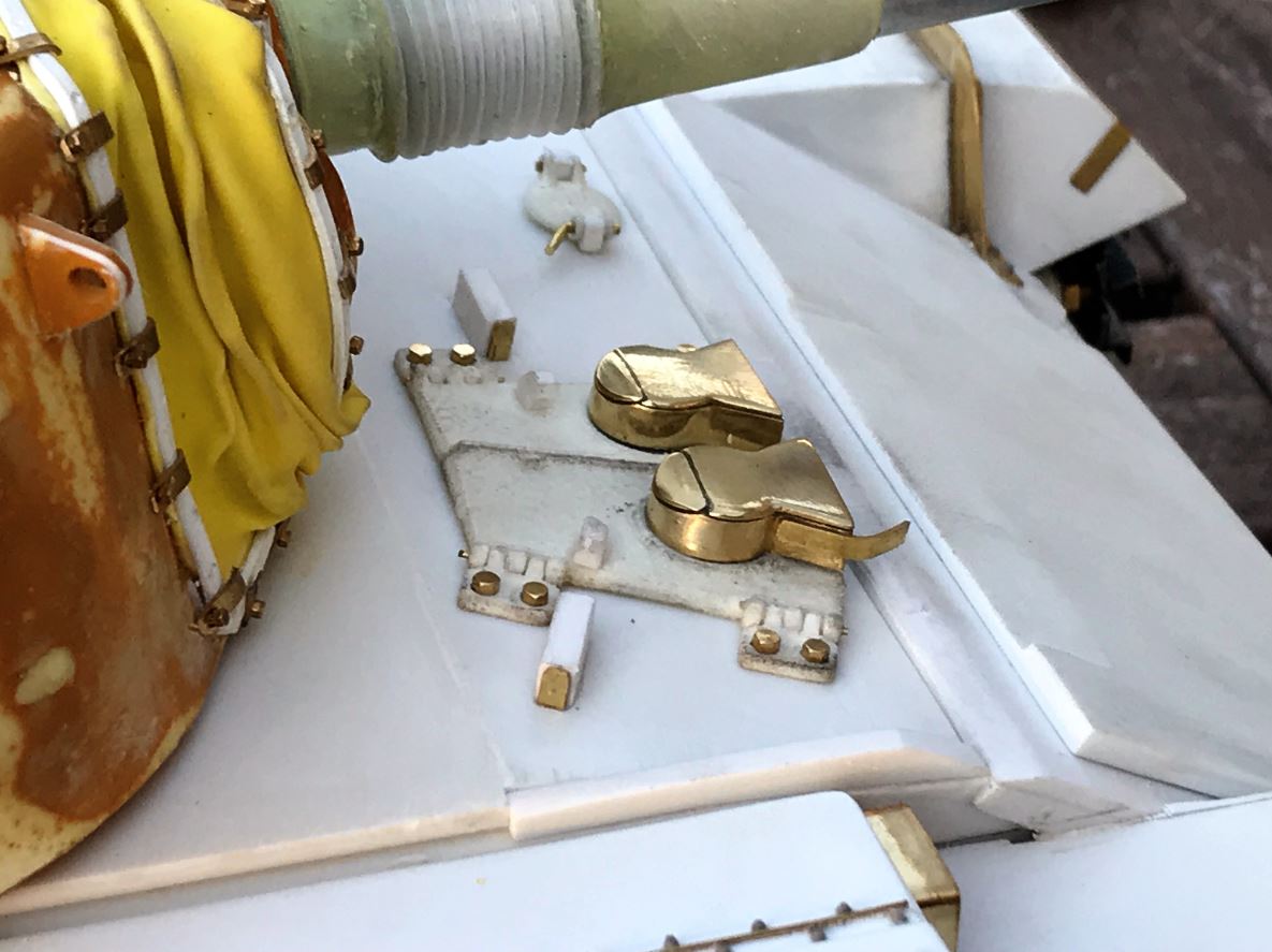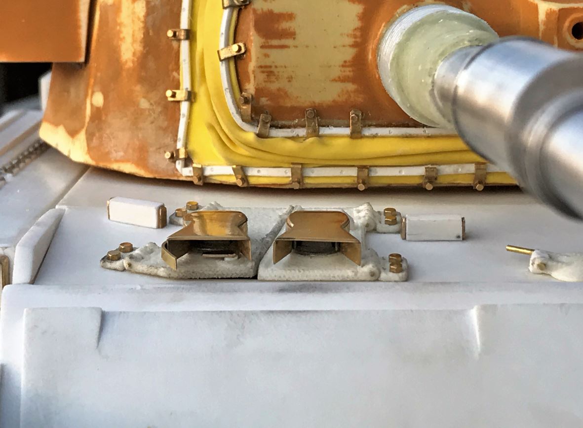 The 3D printed Ludwig hatch opening is made functional with the provided hinges. The IDF Centurion have a different external periscope cover. I saw two kinds of cover in murky, partial and rare references. I did some interpretations and repro one version in brass as an overlay cover for both sides.