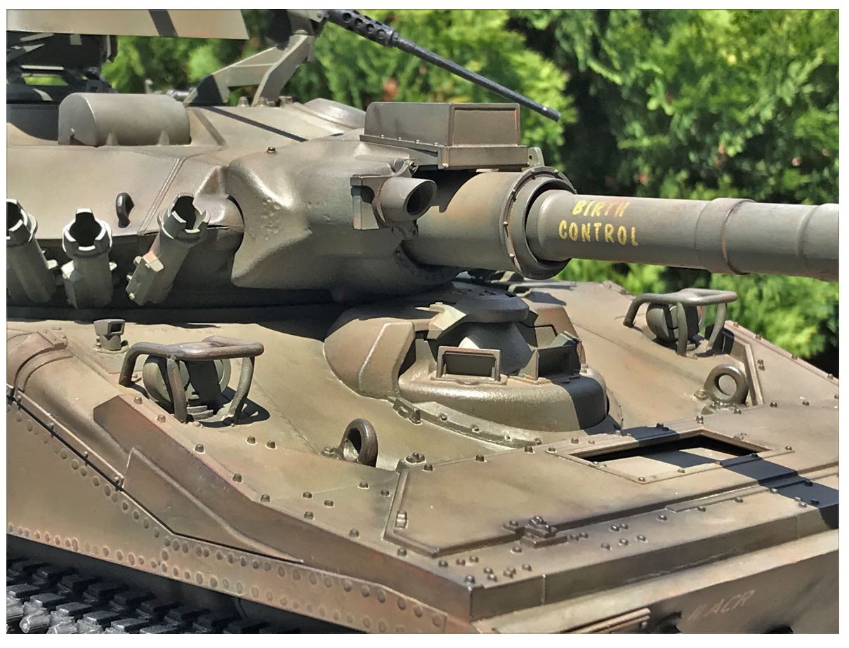 The tank itself is sarcastically named "Birth Control" and is applied on the main gun. Both names were done with Archer Transfers.