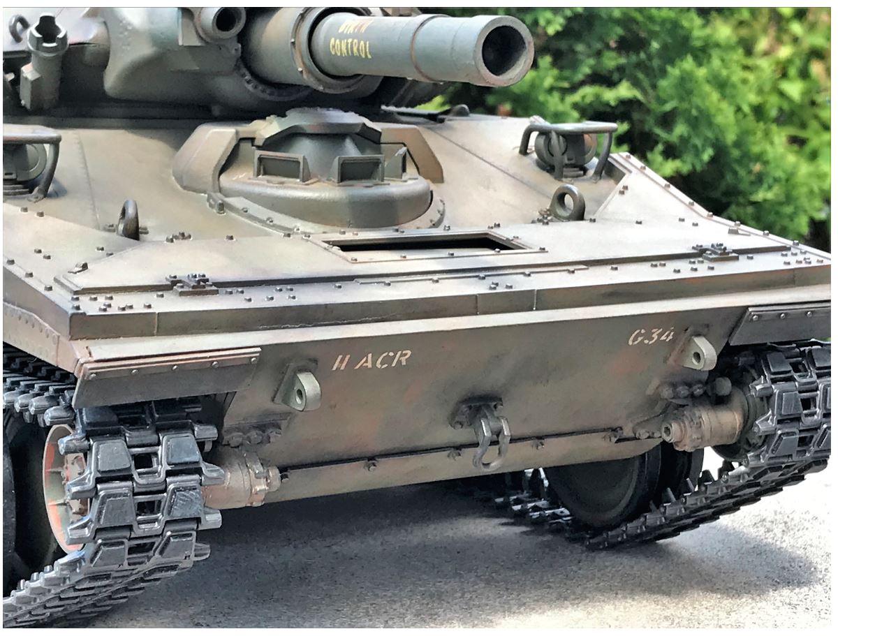 It was simple to convert the static Sheridan into an RC version. The only design challenge was to make the Tamiya sprocket shaft fit the Mato 5.0 gearbox as seen in the first couple of posts. The rest was real easy and the Sheridan runs like a charm. As I already had electronics available, I must have saved about $500 which I partly reinvested into figures and accessories for a unique build that is both RC and display scale model.
