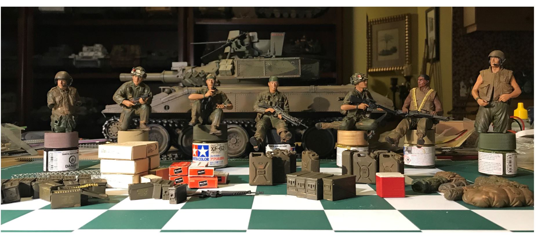 Overview of the stowage and the crew that were prepared so far. I am still waiting for a few items in the mail and to build a few myself, but this will have to do. I order to determine what to show on the tank, I put myself in the shoes of the commander to determine what I would bring for at least a month long operation, in the middle of nowhere, thick jungle, bad roads, in the heat of summer. Need to be able to sustain operations for a few days between resupply, length of mission and enemy strength undetermined. I addition to the few items that the tank can carry internally, most of the stuff will have to fit in the turret basket and around the hull.