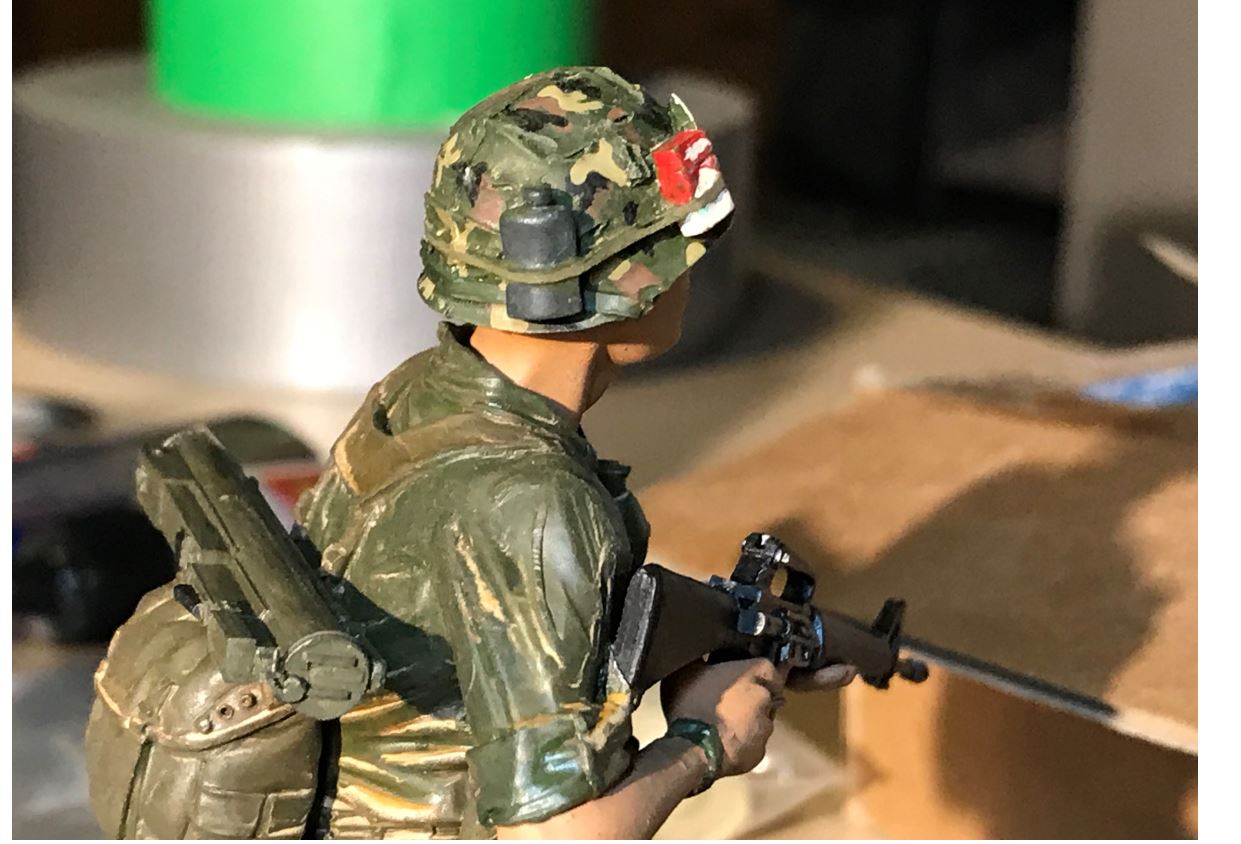 The building of Vietnam war era vehicles allows the modeller a lot of liberties that are no longer possible with current environment and vehicles. Uniforms and equipment of professional modern armies look very much the same now. As much as I would like to make Bundeswehr or any western army soldiers look cool, different from on another, or have something special, its difficult. The gypsy looking style of conscripted or mercenary armies has been replaced by professional "Tacti-cool" soldiers loaded with complex standard equipment, lots of padding, same body shape, all very controlled and politically correct.