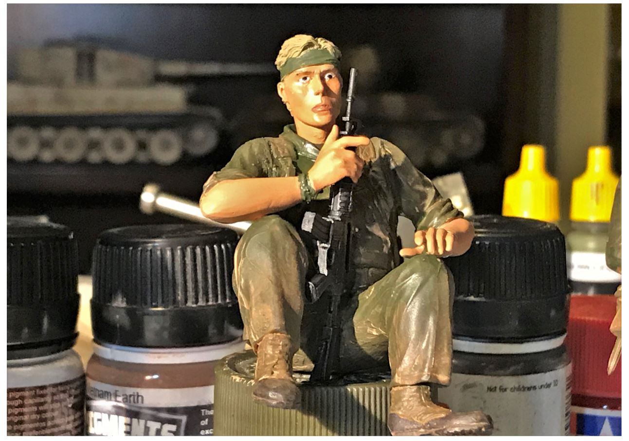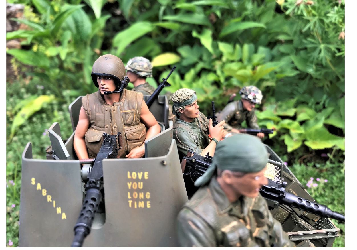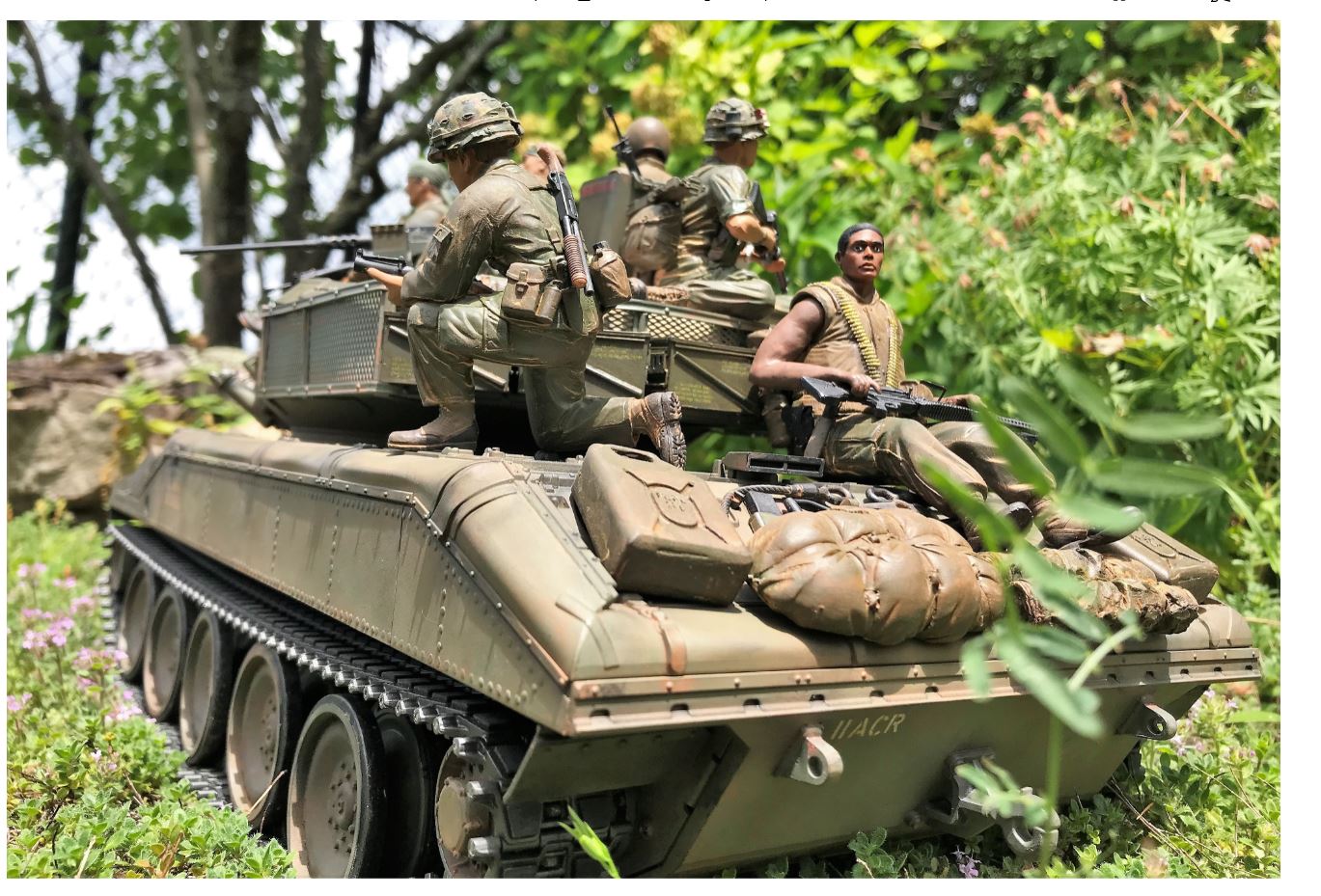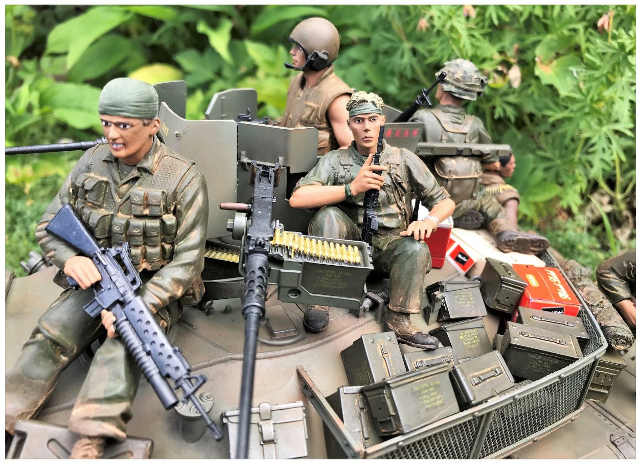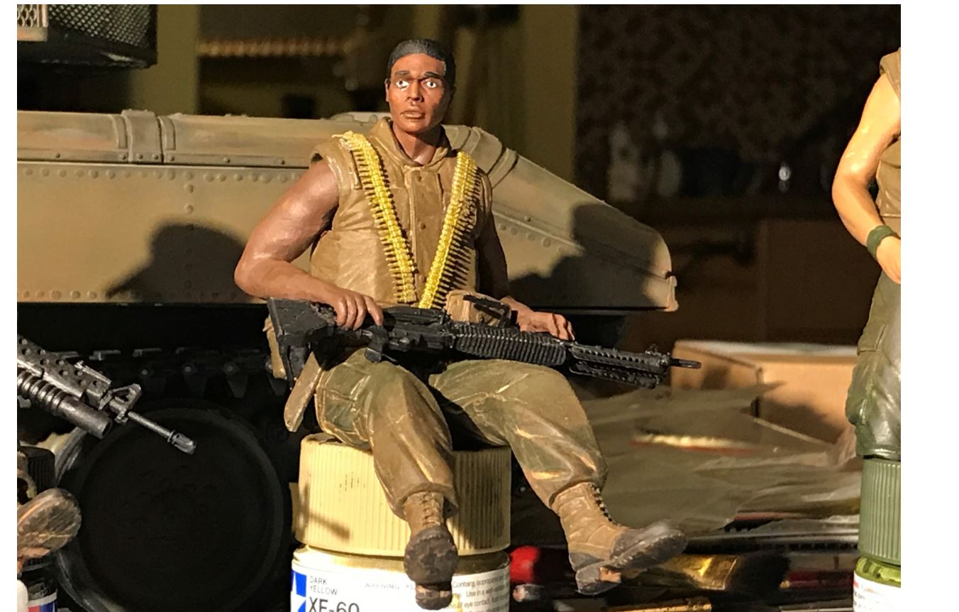 A Vietnam war scene is realistic when presenting black soldiers. He is armed with an M-60 machine gun and a M-1911 pistol. He is covering the back and right of the tank.