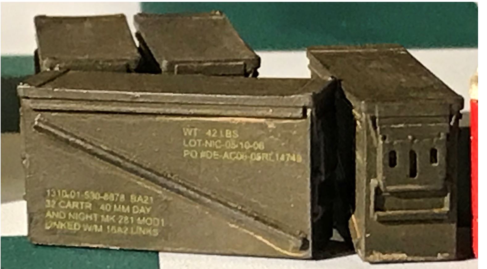 - 4 boxes for 40mm grenades, actually used to carry the crews personal stuff, its waterproof, one each. checked.