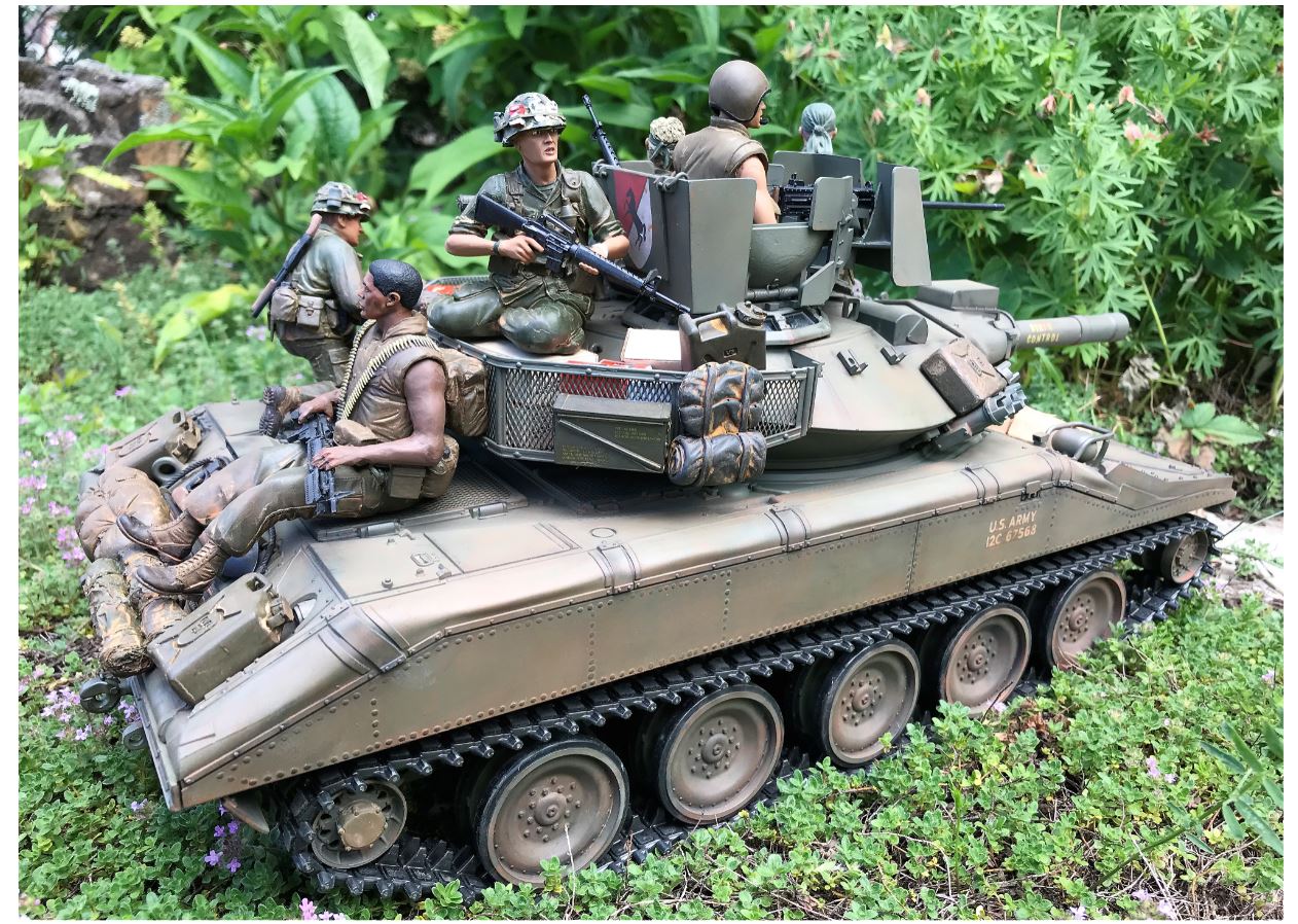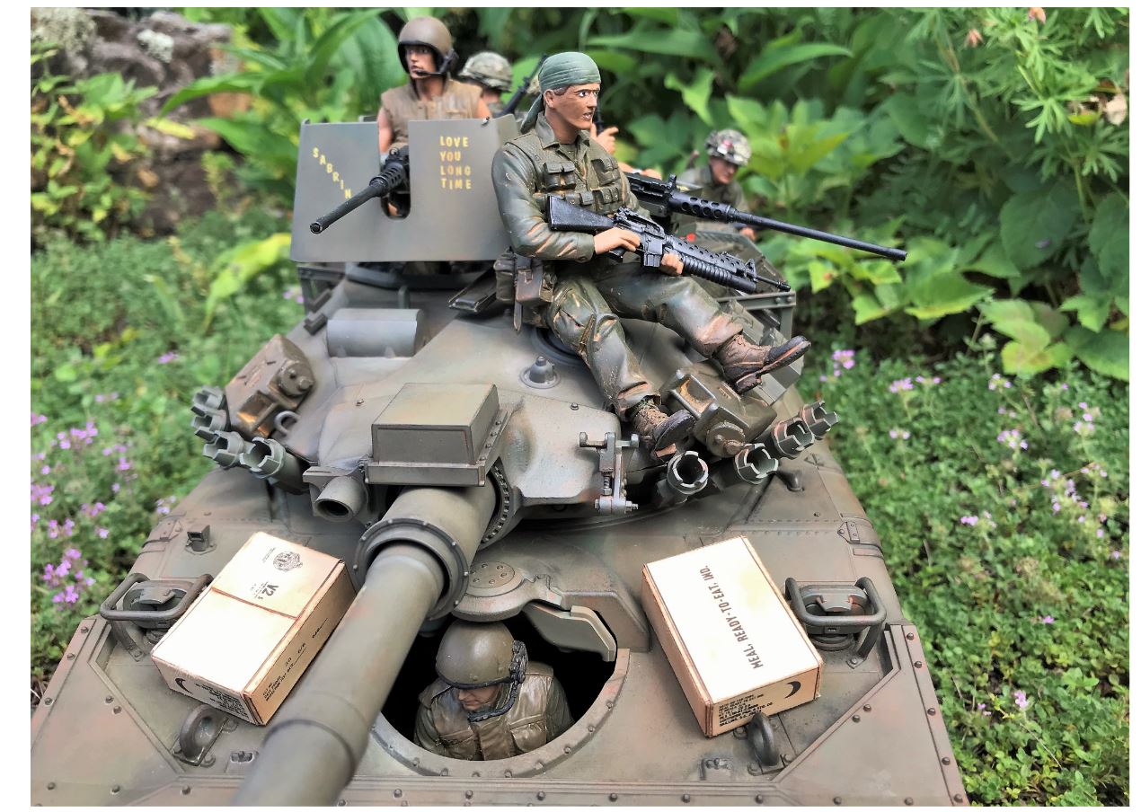 The scenario for this build is the US invasion of Cambodia during April-June 1970, which makes me realize it is the 50th anniversary. This was a limited incursion to destroy enemy bases. Sheridans of the 11th ACR (Armored Cavalry Regiment) accompanied by its M-113 ACAV spearheaded the operation. The build is showing a vehicle of the 11th in this operation as seen in references. As such, it needs to have a lot of stowage to be realistic. Can't show a clean vehicle as if it was on a week-end show of force on a German autobahn, or on a short patrol around base. It needs to be messy and everything really dirty, men included.